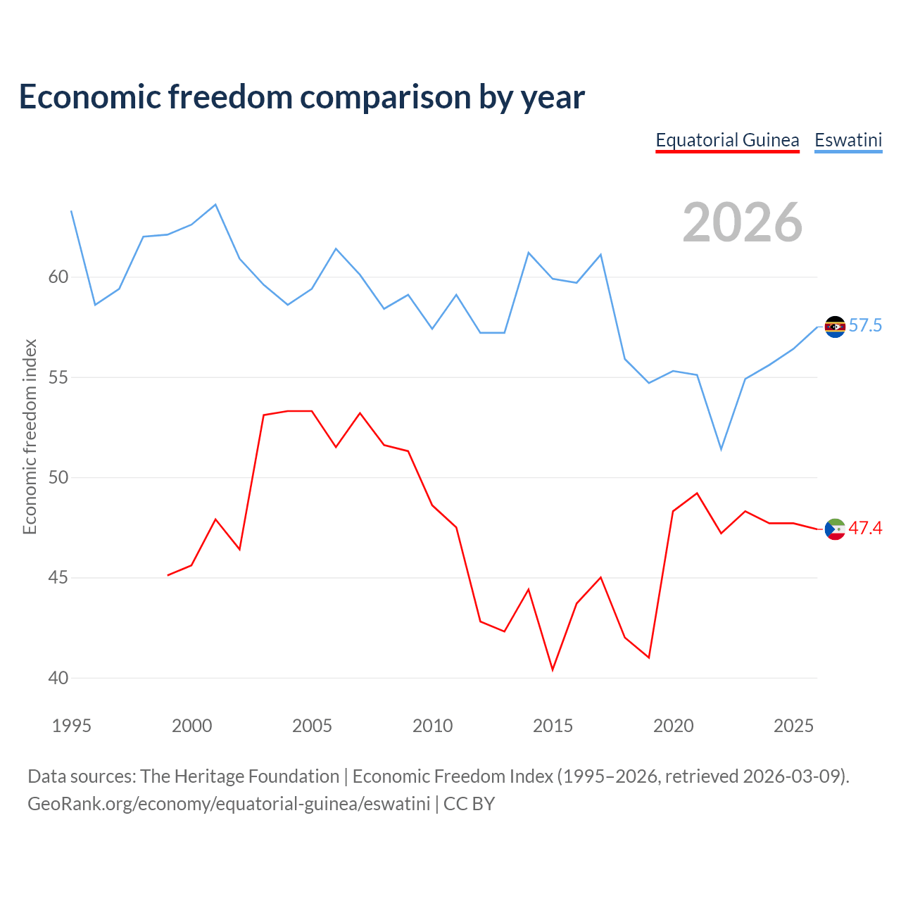 The Economic Freedom Index for Equatorial Guinea is 47.4, ranking 175/197, compared to 57.5 for Eswatini, ranking 116/197. The chart above displays a comparison of annual changes in economic freedom indexes.