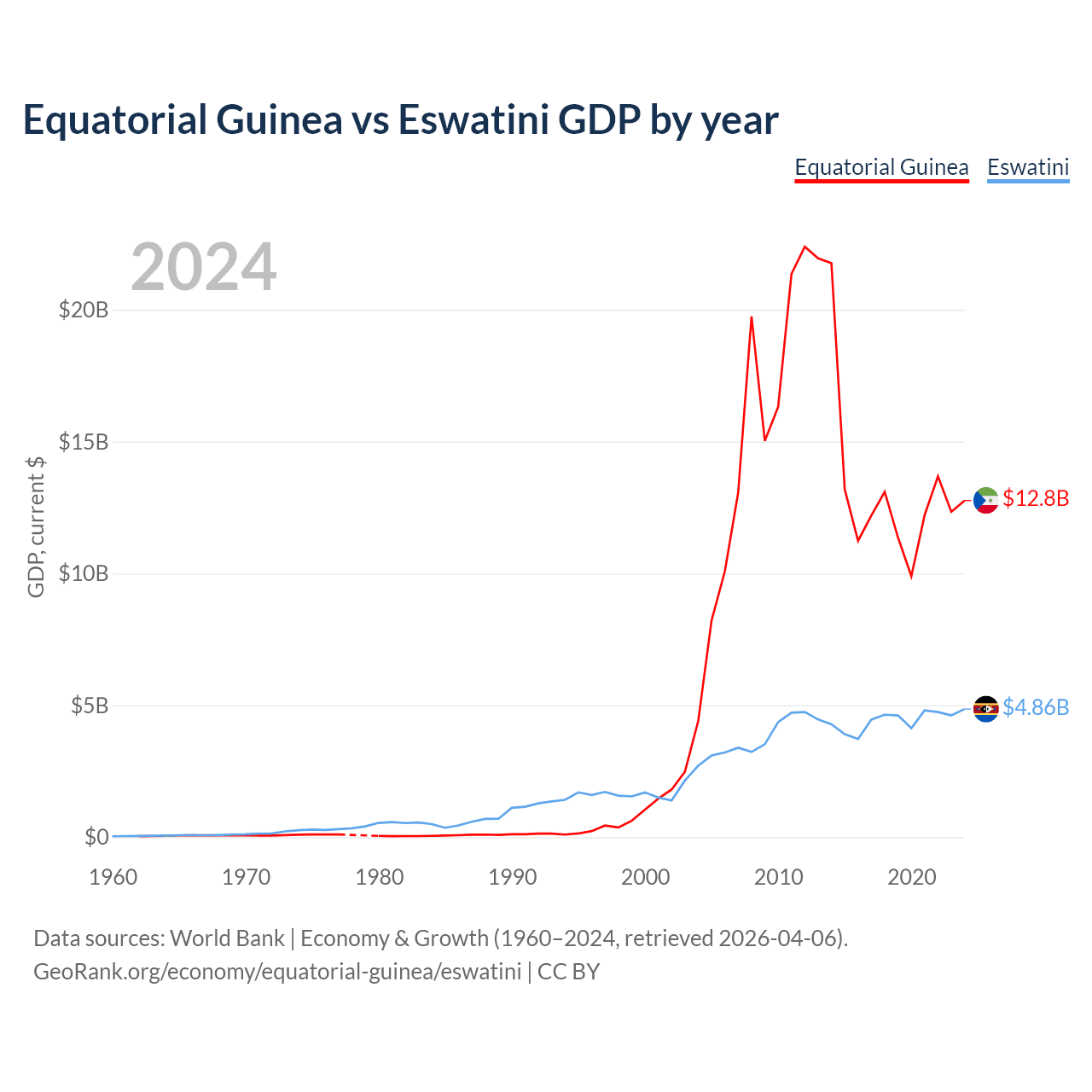 Equatorial Guinea has a GDP of $12.8B compared to $4.86B for Eswatini, ranking 148/197 and 162/197 by economy size, respectively.