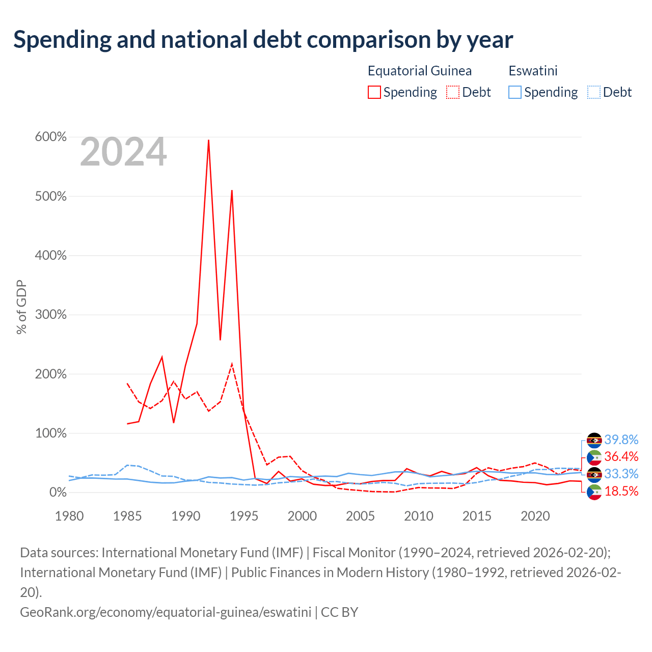 Equatorial Guinea has $4.65B in government debt (36.4% of GDP), compared to $1.93B (39.8% of GDP) in Eswatini.