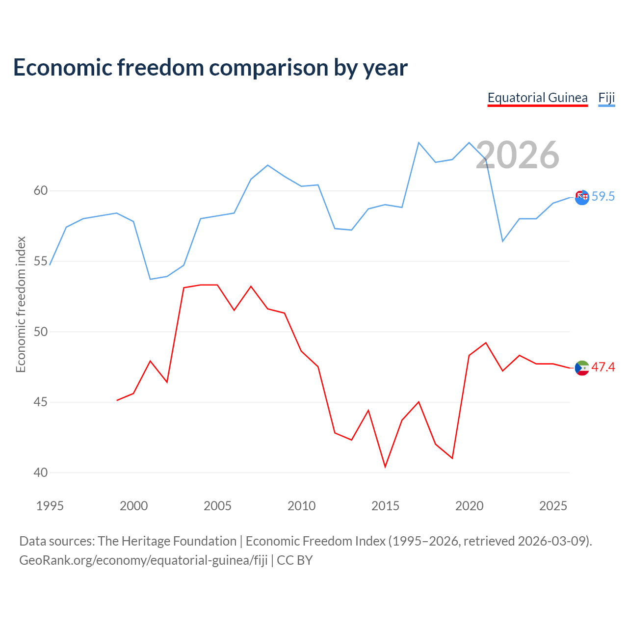The Economic Freedom Index for Equatorial Guinea is 47.4, ranking 175/197, compared to 59.5 for Fiji, ranking 103/197. The chart above displays a comparison of annual changes in economic freedom indexes.