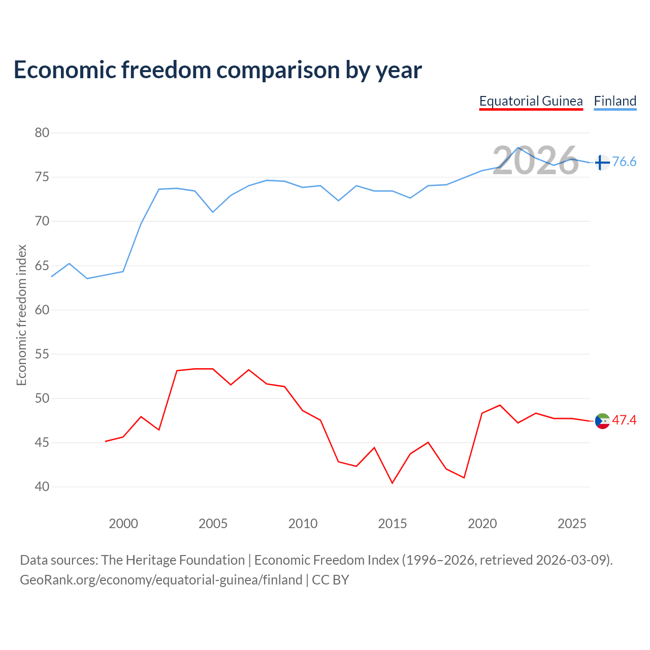 The Economic Freedom Index for Equatorial Guinea is 47.4, ranking 175/197, compared to 76.6 for Finland, ranking 15/197. The chart above displays a comparison of annual changes in economic freedom indexes.