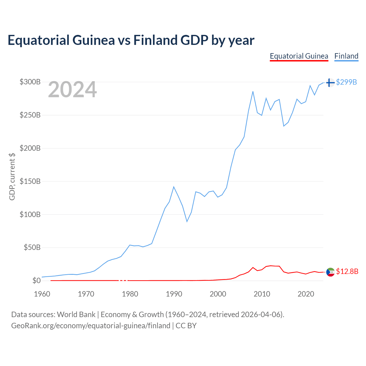 Equatorial Guinea has a GDP of $12.8B compared to $299B for Finland, ranking 148/197 and 47/197 by economy size, respectively.