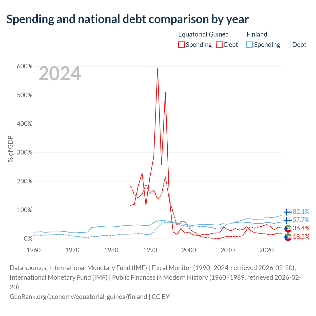 Equatorial Guinea has $4.65B in government debt (36.4% of GDP), compared to $245B (82.1% of GDP) in Finland.