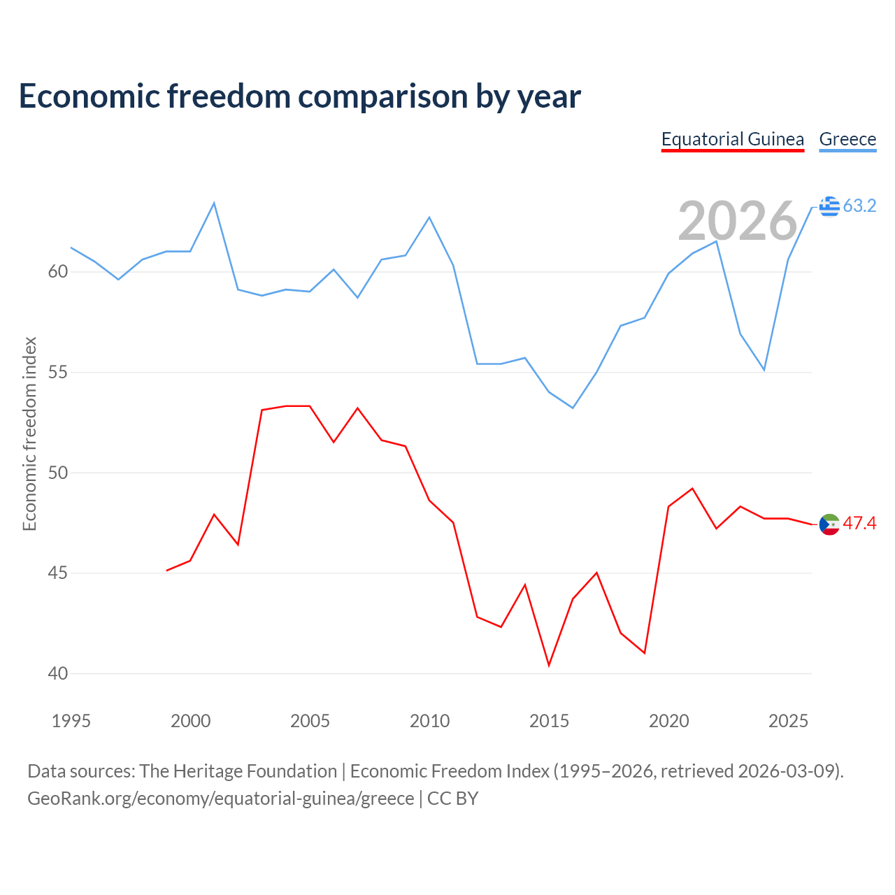 Data sources: The Heritage Foundation | Economic Freedom Index (1995–2026, retrieved 2026-03-09).