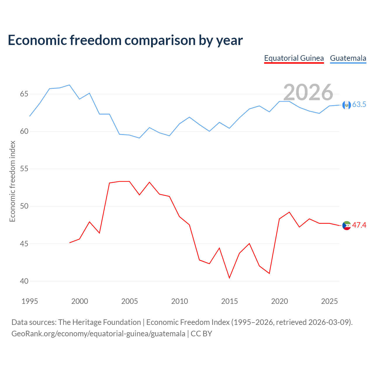 The Economic Freedom Index for Equatorial Guinea is 47.4, ranking 175/197, compared to 63.5 for Guatemala, ranking 79/197. The chart above displays a comparison of annual changes in economic freedom indexes.