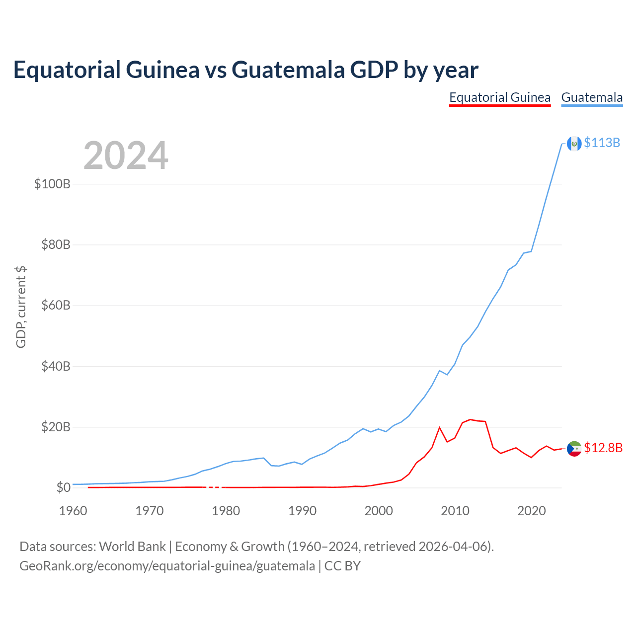 Equatorial Guinea has a GDP of $12.8B compared to $113B for Guatemala, ranking 148/197 and 68/197 by economy size, respectively.