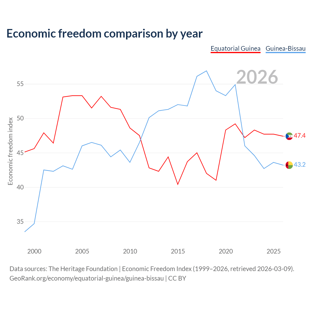 The Economic Freedom Index for Equatorial Guinea is 47.4, ranking 175/197, compared to 43.2 for Guinea-Bissau, ranking 181/197. The chart above displays a comparison of annual changes in economic freedom indexes.