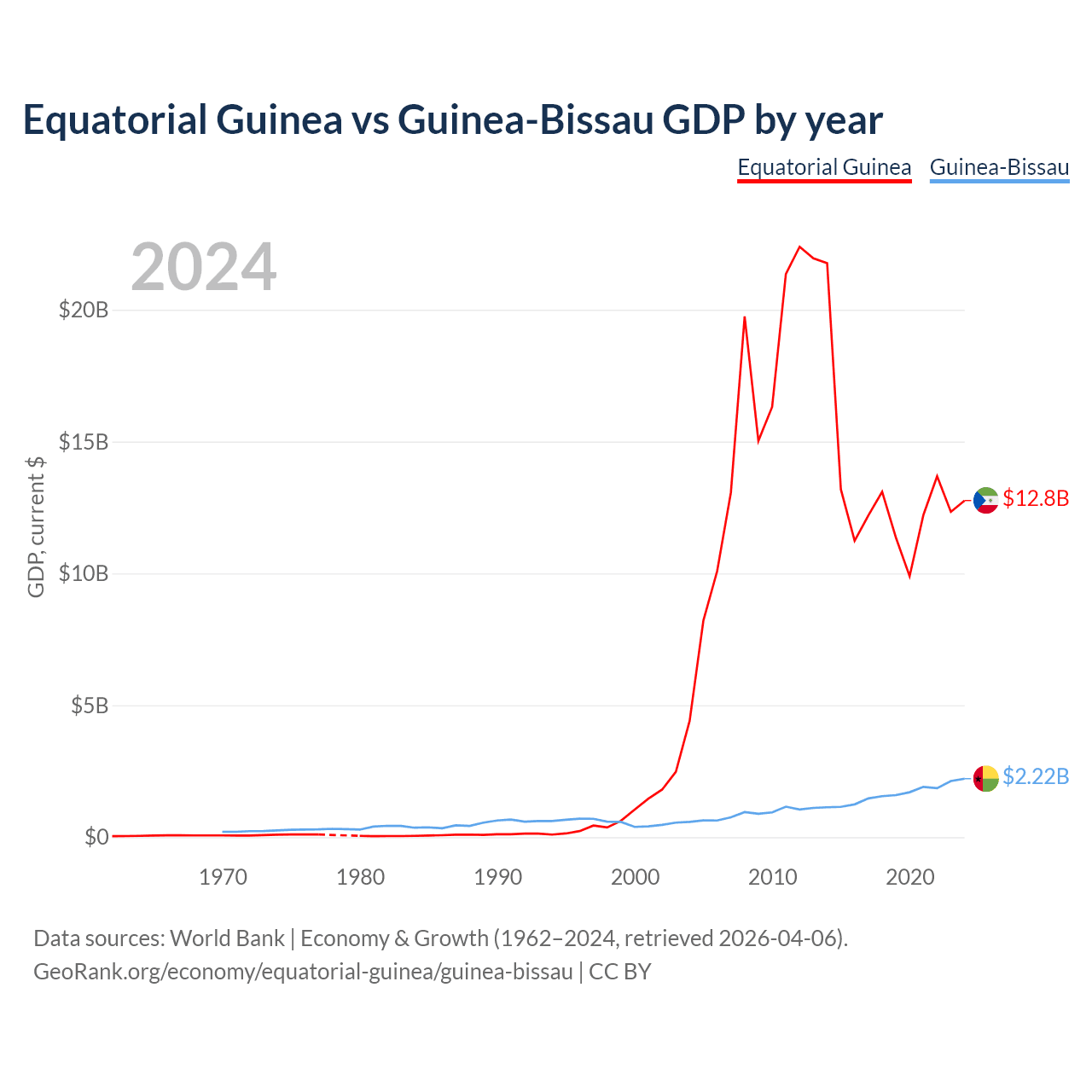 Equatorial Guinea has a GDP of $12.8B compared to $2.22B for Guinea-Bissau, ranking 148/197 and 176/197 by economy size, respectively.