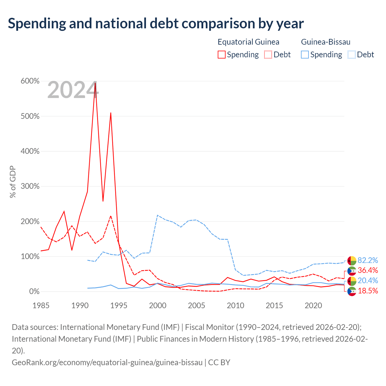 Equatorial Guinea has $4.65B in government debt (36.4% of GDP), compared to $1.82B (82.2% of GDP) in Guinea-Bissau.