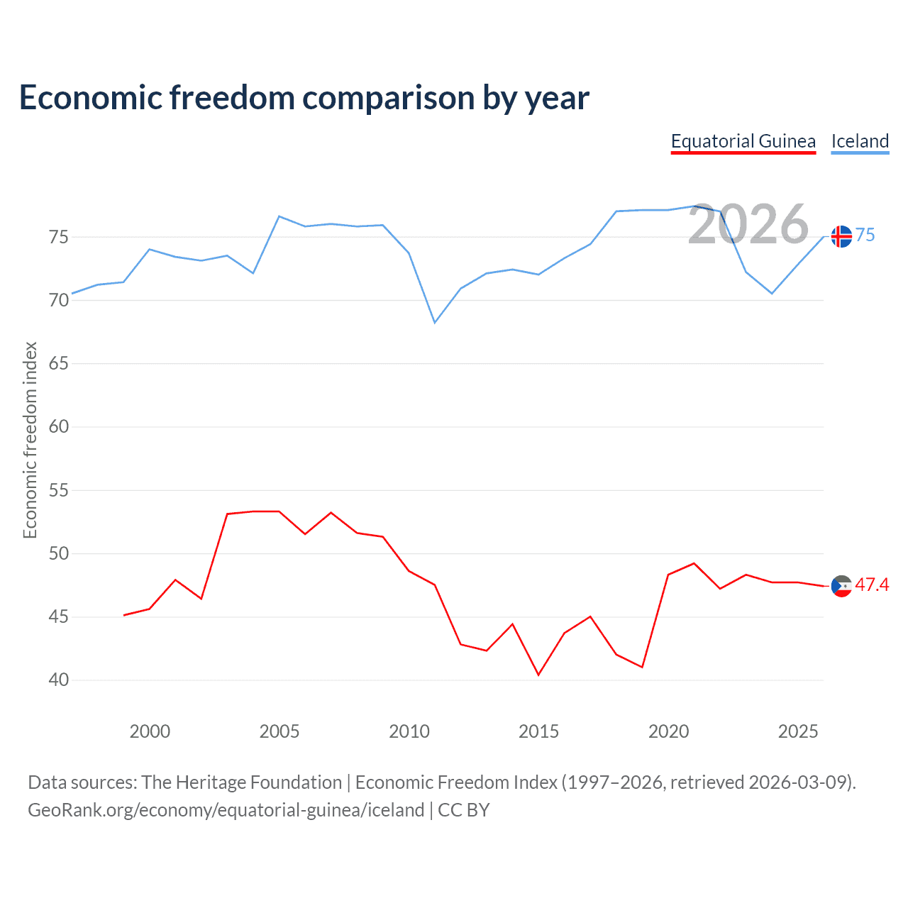 The Economic Freedom Index for Equatorial Guinea is 47.4, ranking 175/197, compared to 75 for Iceland, ranking 19/197. The chart above displays a comparison of annual changes in economic freedom indexes.