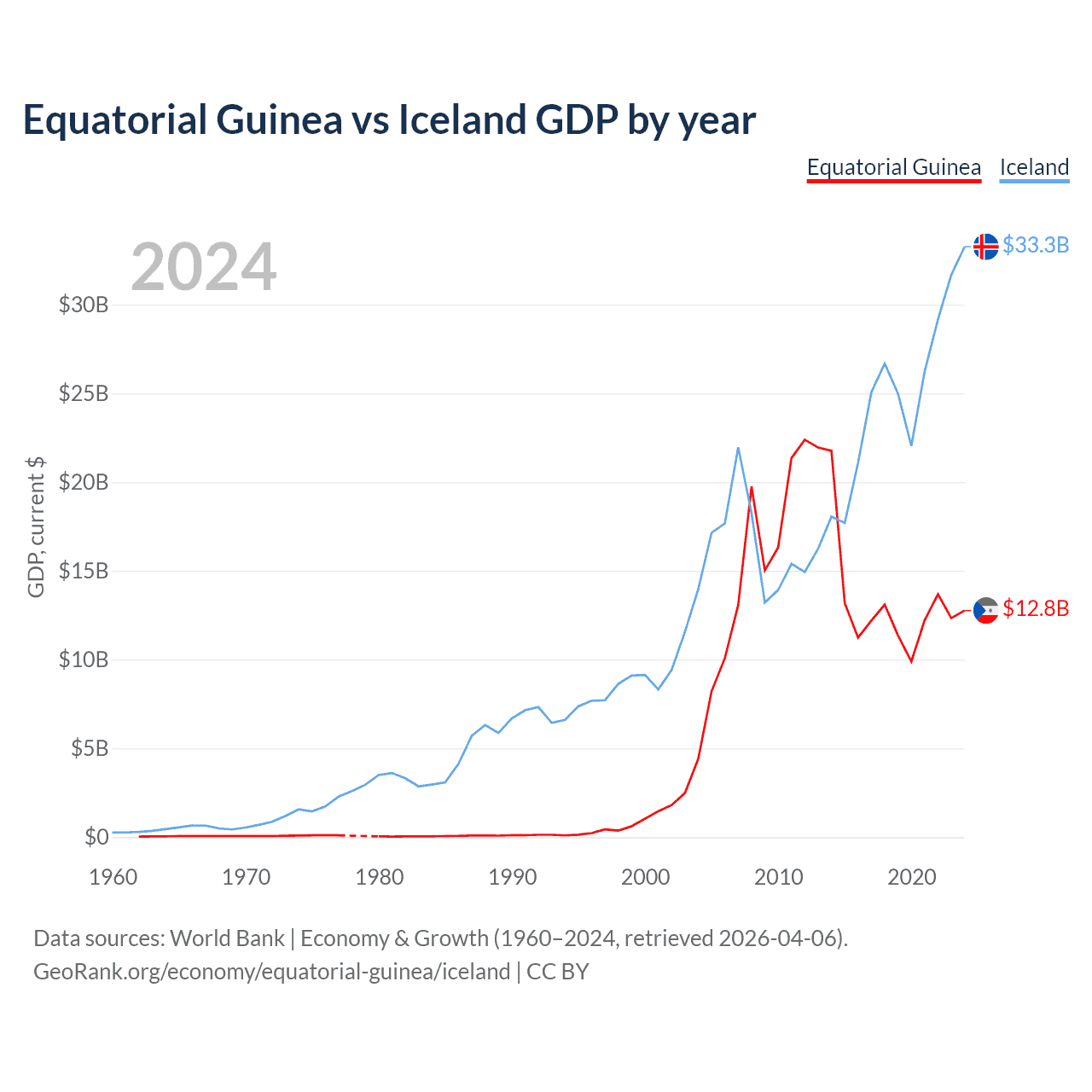 Equatorial Guinea has a GDP of $12.8B compared to $33.3B for Iceland, ranking 148/197 and 108/197 by economy size, respectively.