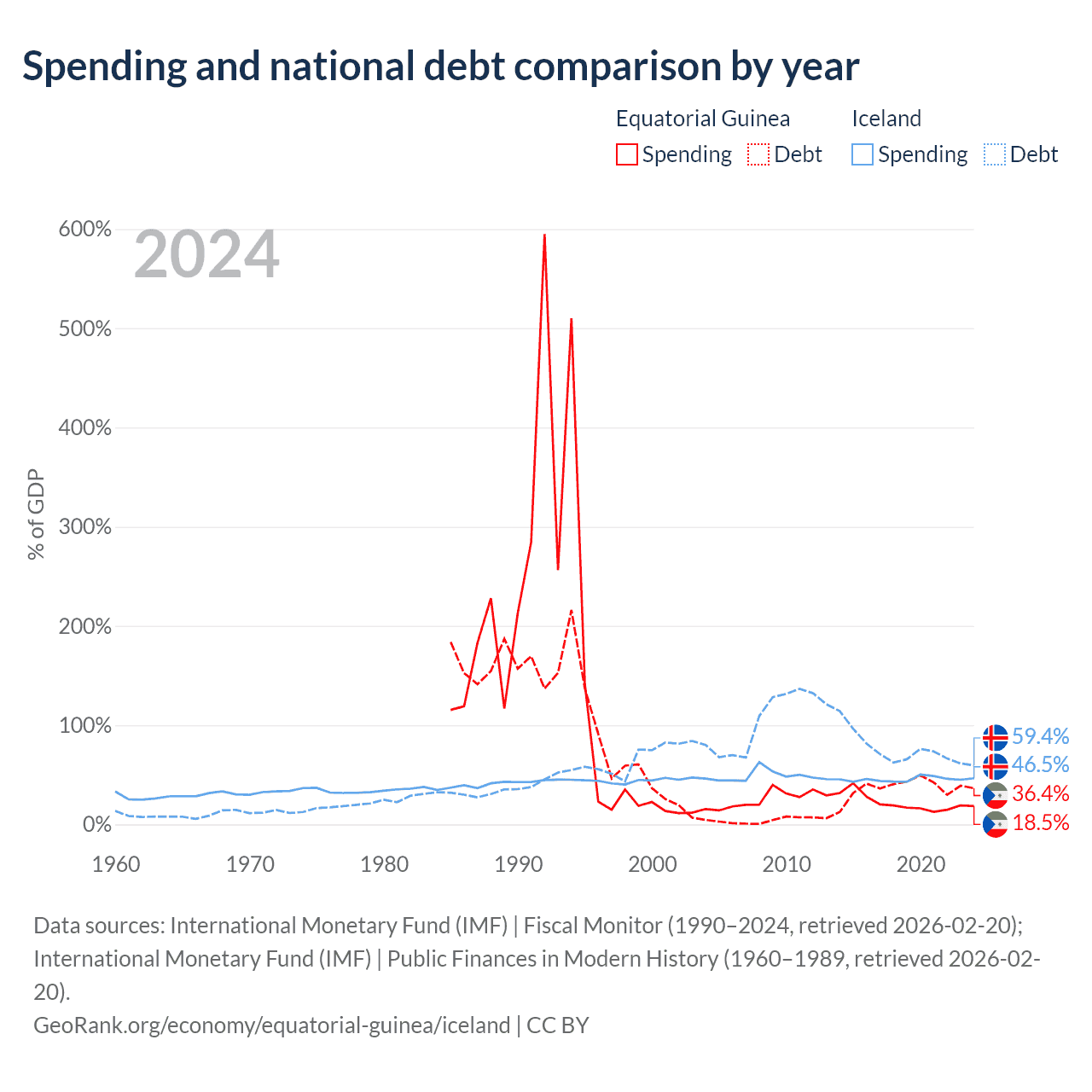 Equatorial Guinea has $4.65B in government debt (36.4% of GDP), compared to $19.8B (59.4% of GDP) in Iceland.