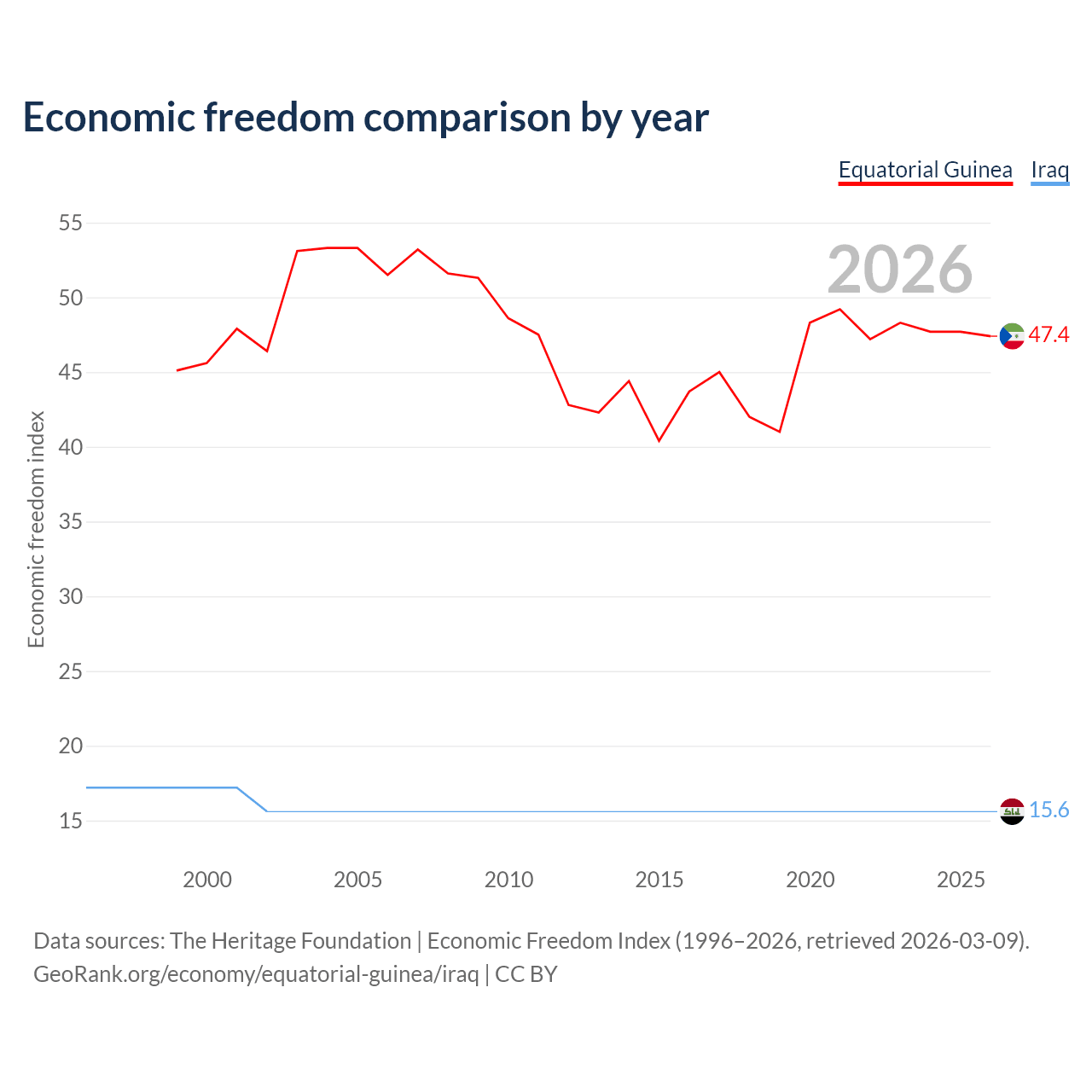 The Economic Freedom Index for Equatorial Guinea is 47.4, ranking 175/197, compared to 15.6 for Iraq, ranking 196/197. The chart above displays a comparison of annual changes in economic freedom indexes.