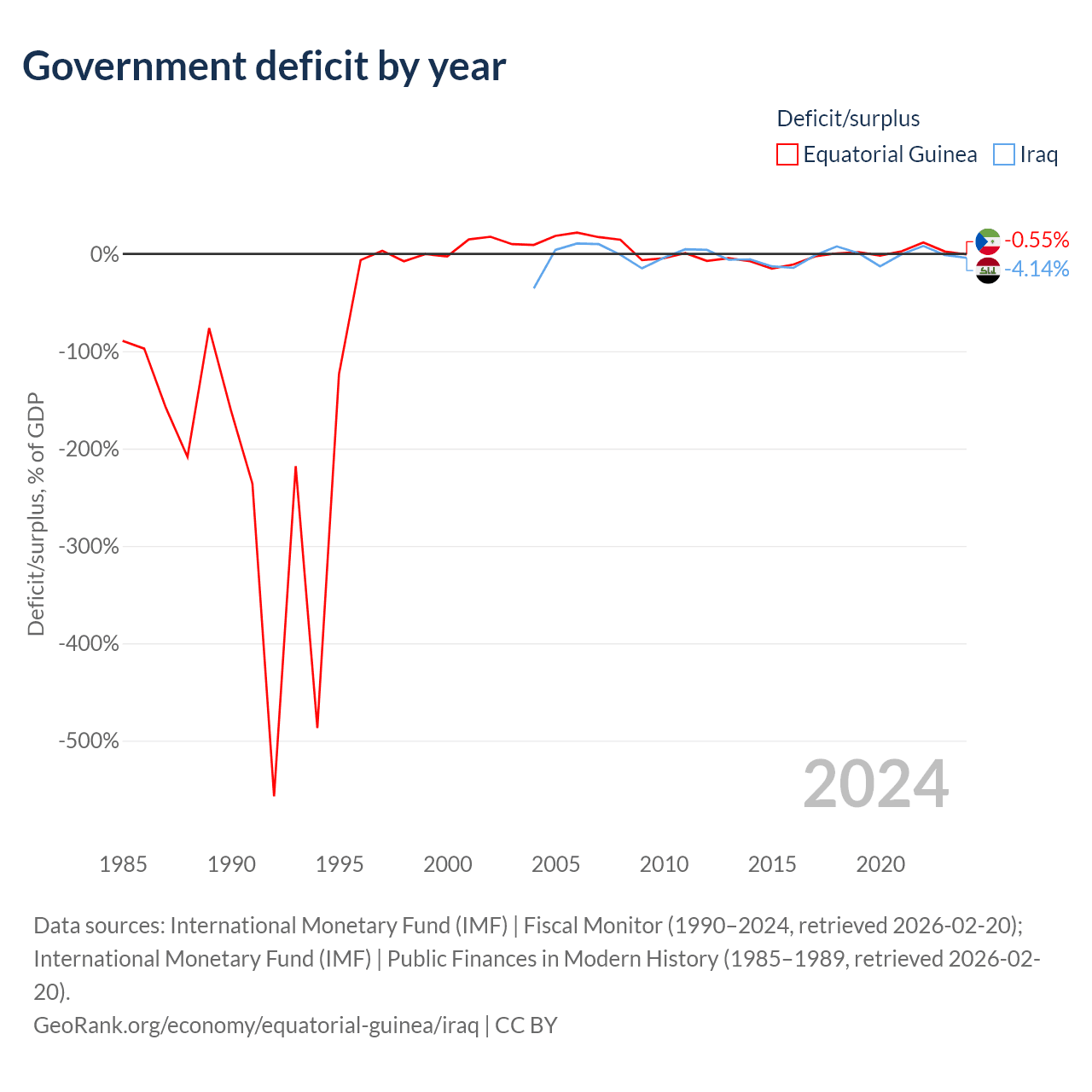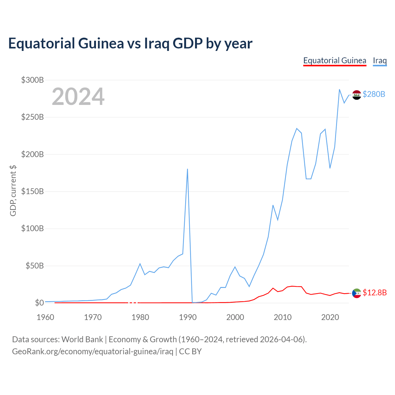 Equatorial Guinea has a GDP of $12.8B compared to $280B for Iraq, ranking 148/197 and 50/197 by economy size, respectively.