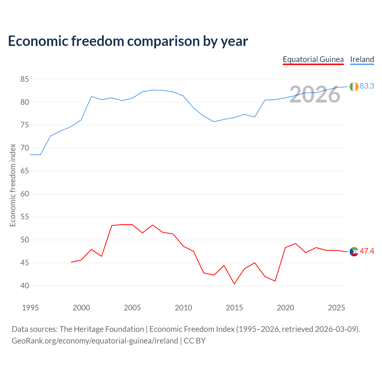 The Economic Freedom Index for Equatorial Guinea is 47.4, ranking 175/197, compared to 83.3 for Ireland, ranking 3/197. The chart above displays a comparison of annual changes in economic freedom indexes.