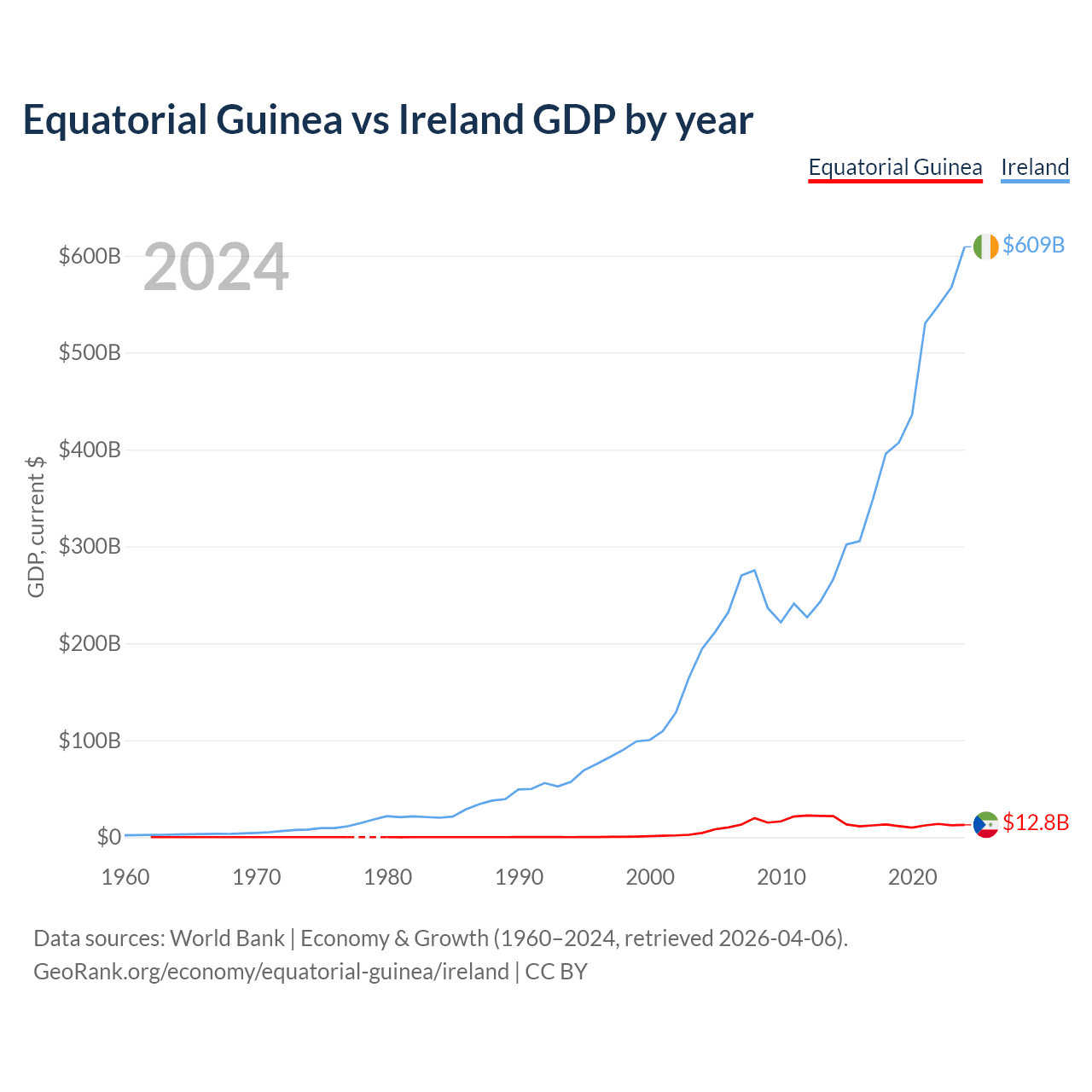 Equatorial Guinea has a GDP of $12.8B compared to $609B for Ireland, ranking 148/197 and 25/197 by economy size, respectively.