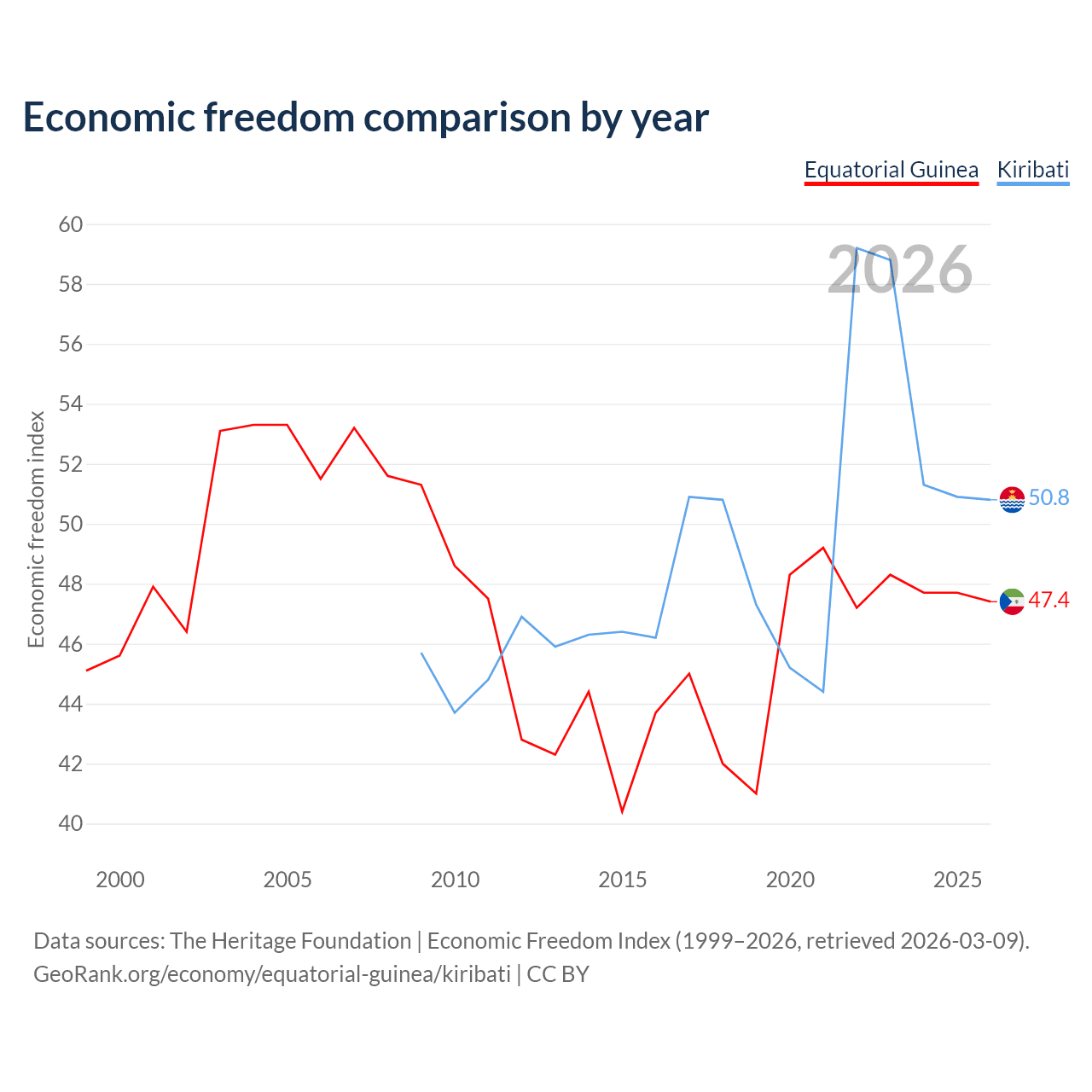 The Economic Freedom Index for Equatorial Guinea is 47.4, ranking 175/197, compared to 50.8 for Kiribati, ranking 158/197. The chart above displays a comparison of annual changes in economic freedom indexes.