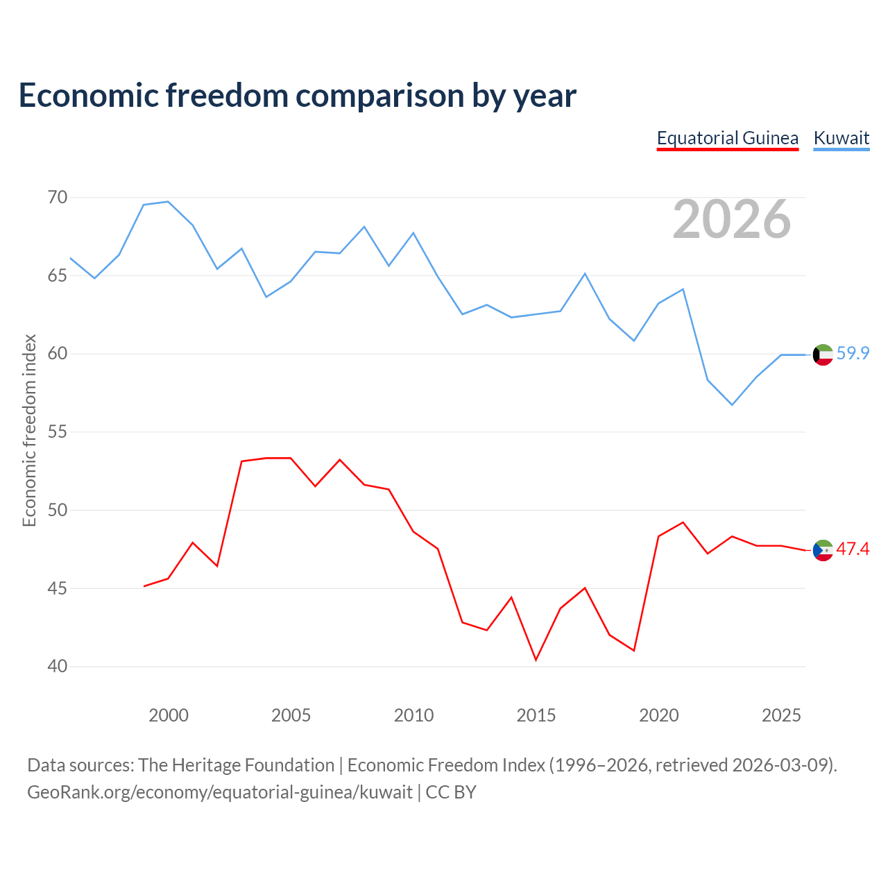 The Economic Freedom Index for Equatorial Guinea is 47.4, ranking 175/197, compared to 59.9 for Kuwait, ranking 100/197. The chart above displays a comparison of annual changes in economic freedom indexes.