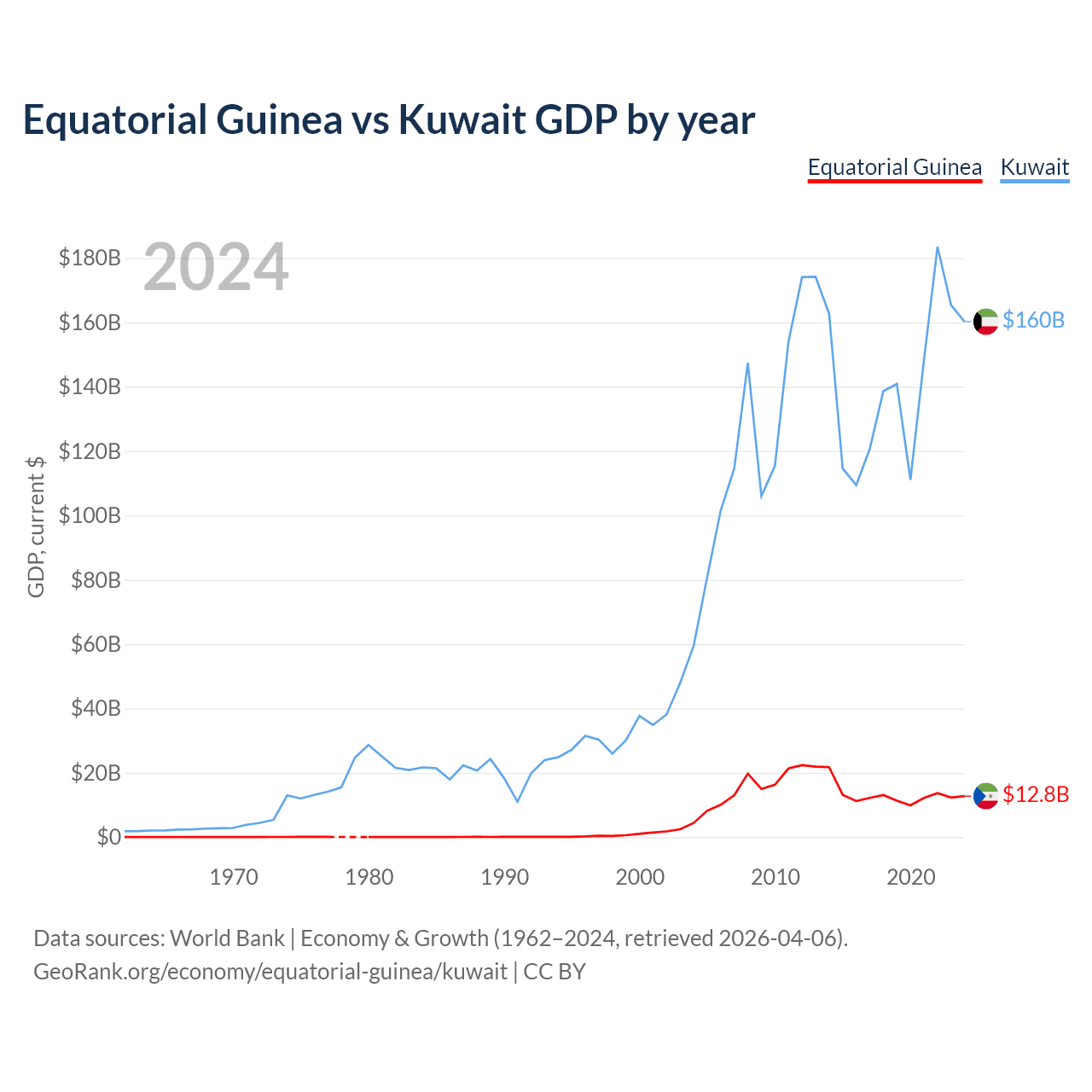 Equatorial Guinea has a GDP of $12.8B compared to $160B for Kuwait, ranking 148/197 and 59/197 by economy size, respectively.