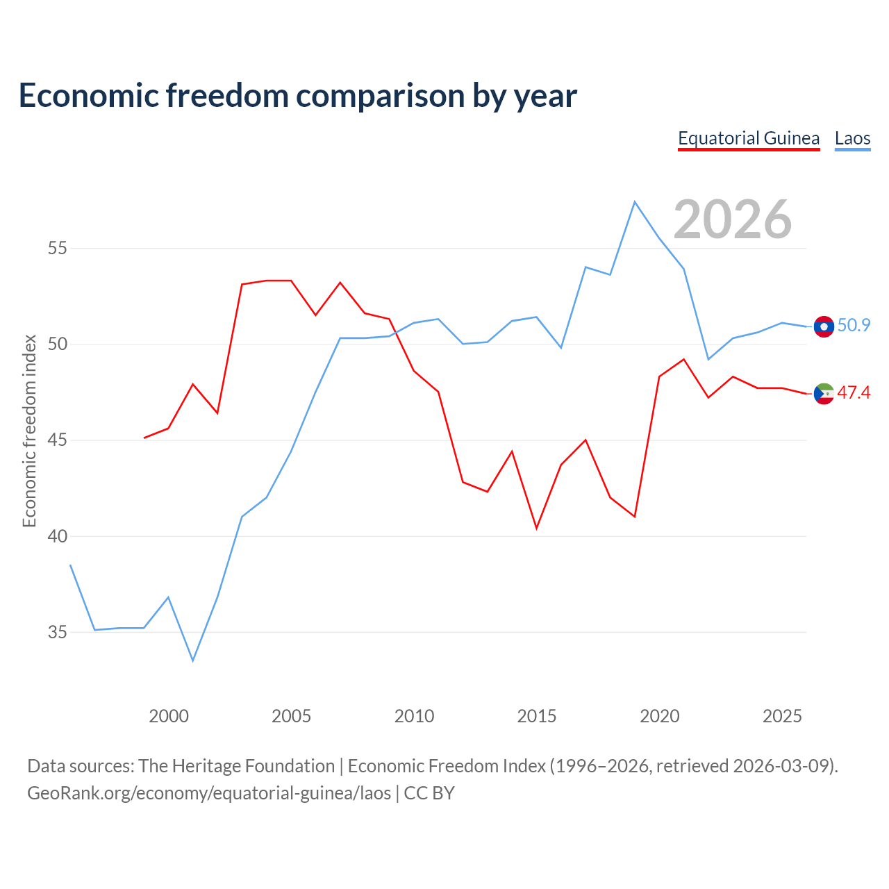 The Economic Freedom Index for Equatorial Guinea is 47.4, ranking 175/197, compared to 50.9 for Laos, ranking 157/197. The chart above displays a comparison of annual changes in economic freedom indexes.