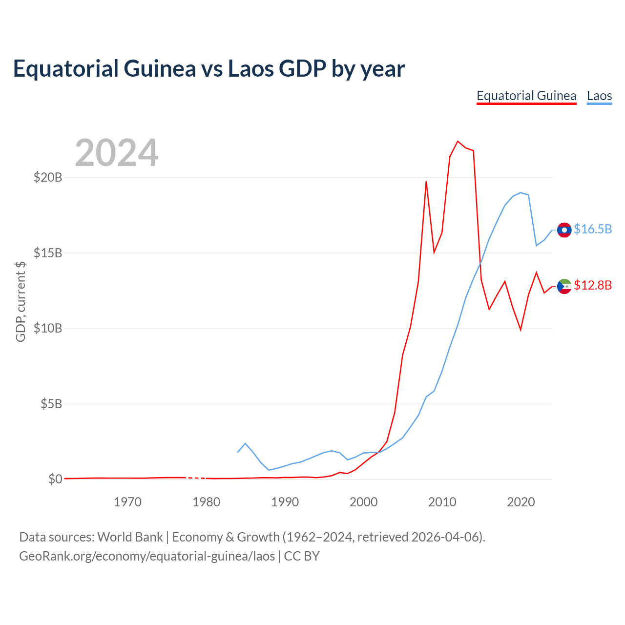 Equatorial Guinea has a GDP of $12.8B compared to $16.5B for Laos, ranking 148/197 and 139/197 by economy size, respectively.