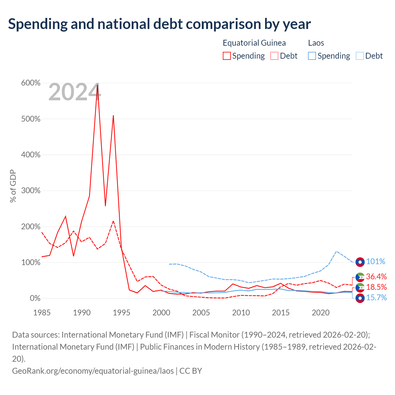Equatorial Guinea has $4.65B in government debt (36.4% of GDP), compared to $16.6B (100.5% of GDP) in Laos.