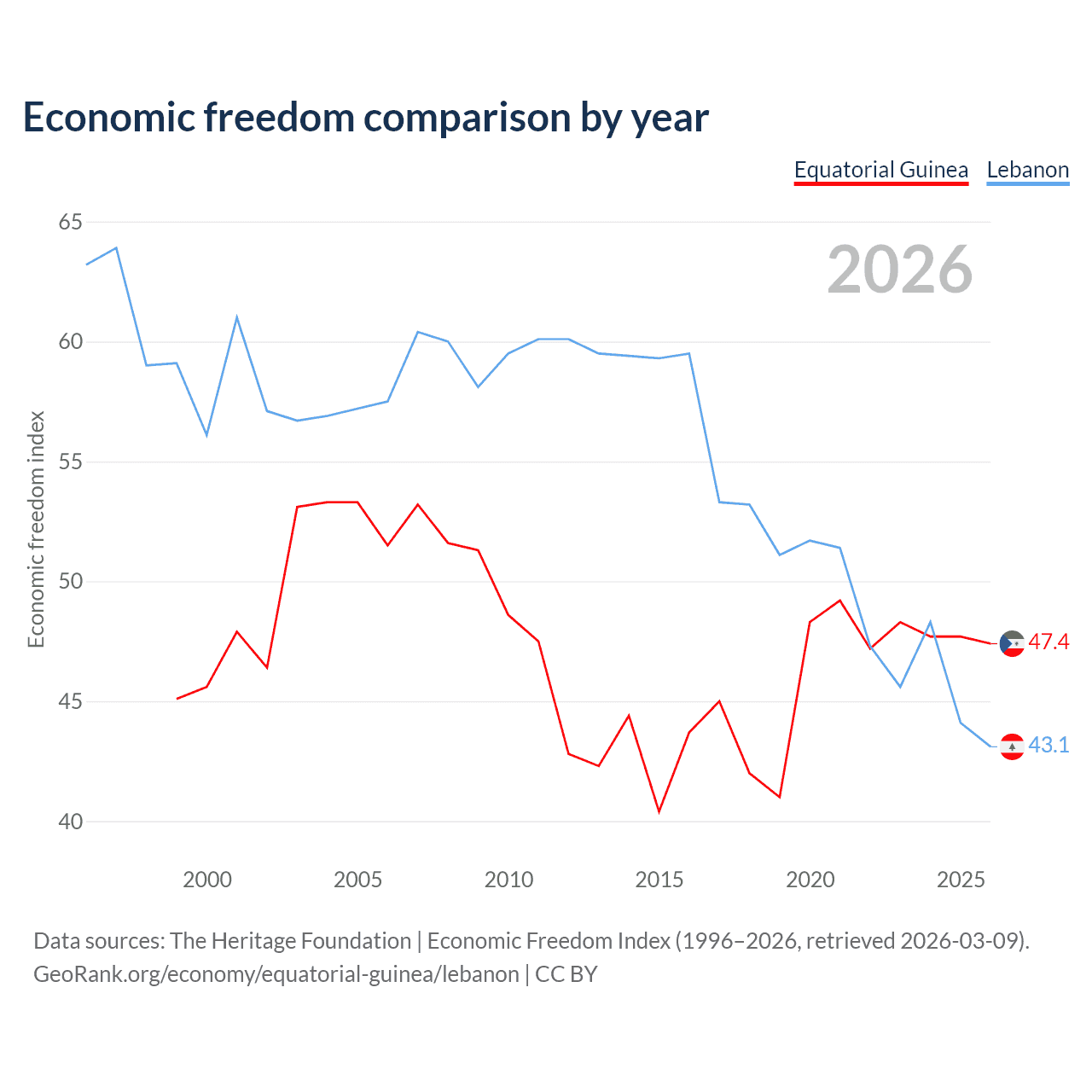 The Economic Freedom Index for Equatorial Guinea is 47.4, ranking 175/197, compared to 43.1 for Lebanon, ranking 183/197. The chart above displays a comparison of annual changes in economic freedom indexes.