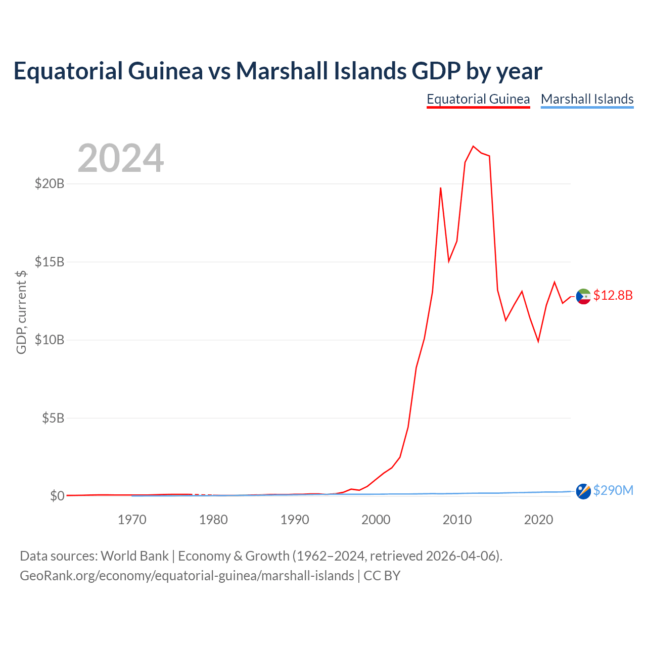 Equatorial Guinea has a GDP of $12.8B compared to $290M for the Marshall Islands, ranking 148/197 and 193/197 by economy size, respectively.
