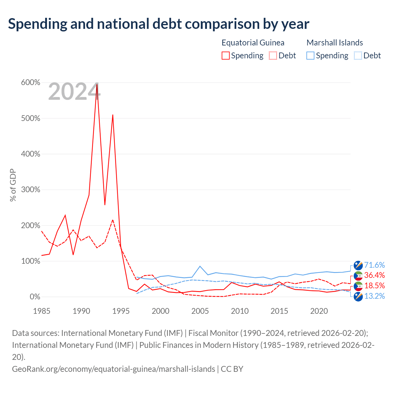 Equatorial Guinea has $4.65B in government debt (36.4% of GDP), compared to $38.4M (13.2% of GDP) in the Marshall Islands.