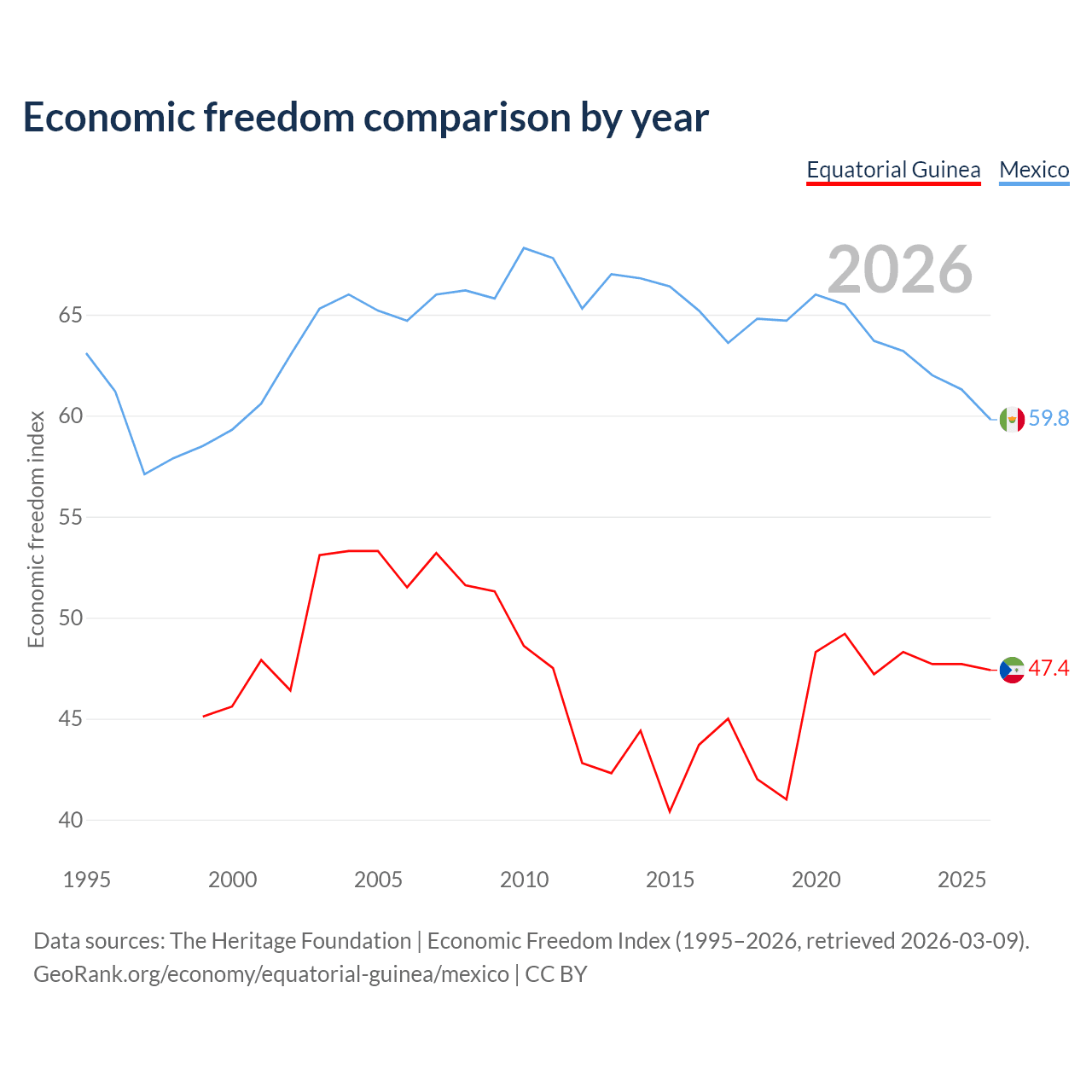 The Economic Freedom Index for Equatorial Guinea is 47.4, ranking 175/197, compared to 59.8 for Mexico, ranking 102/197. The chart above displays a comparison of annual changes in economic freedom indexes.
