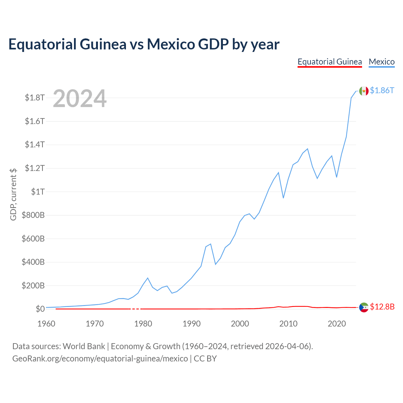 Equatorial Guinea has a GDP of $12.8B compared to $1.86T for Mexico, ranking 148/197 and 13/197 by economy size, respectively.