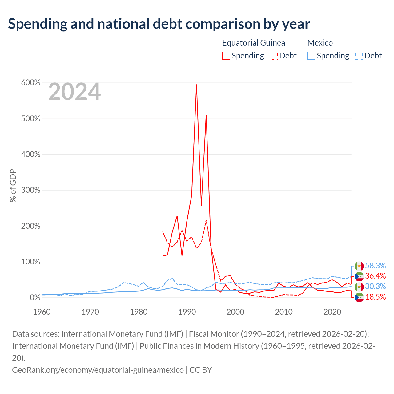 Equatorial Guinea has $4.65B in government debt (36.4% of GDP), compared to $1.08T (58.3% of GDP) in Mexico.