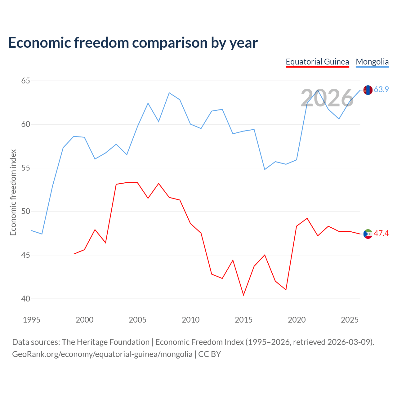 The Economic Freedom Index for Equatorial Guinea is 47.4, ranking 175/197, compared to 63.9 for Mongolia, ranking 76/197. The chart above displays a comparison of annual changes in economic freedom indexes.