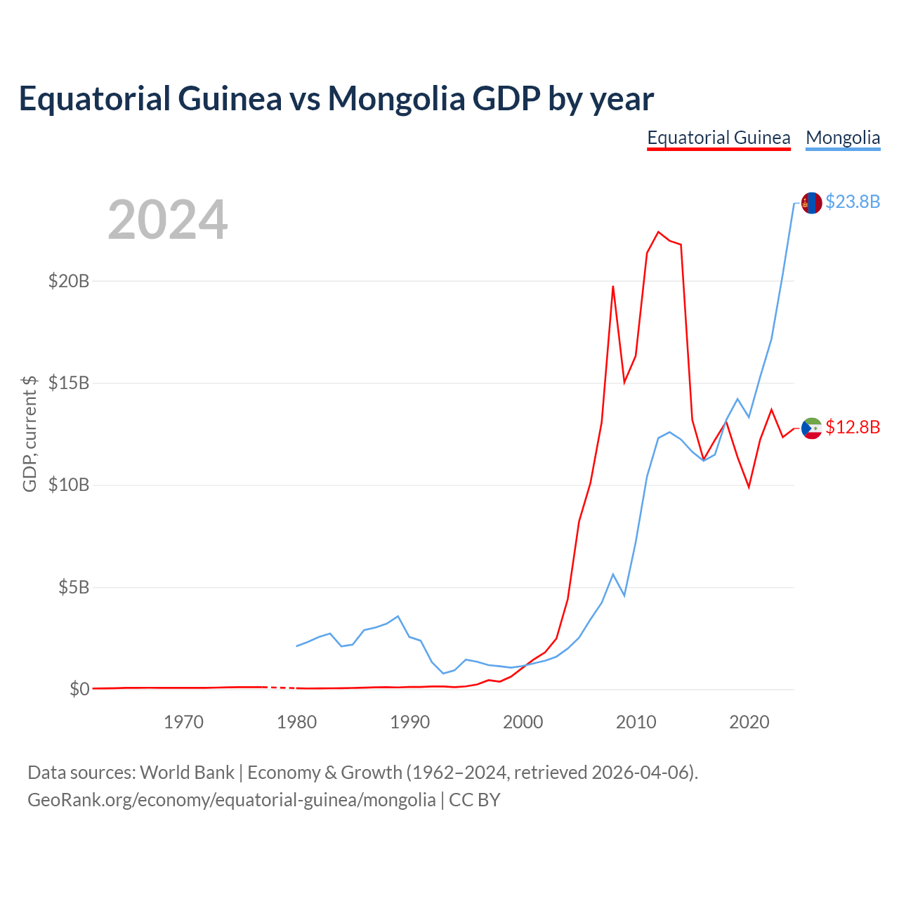 Equatorial Guinea has a GDP of $12.8B compared to $23.8B for Mongolia, ranking 148/197 and 121/197 by economy size, respectively.