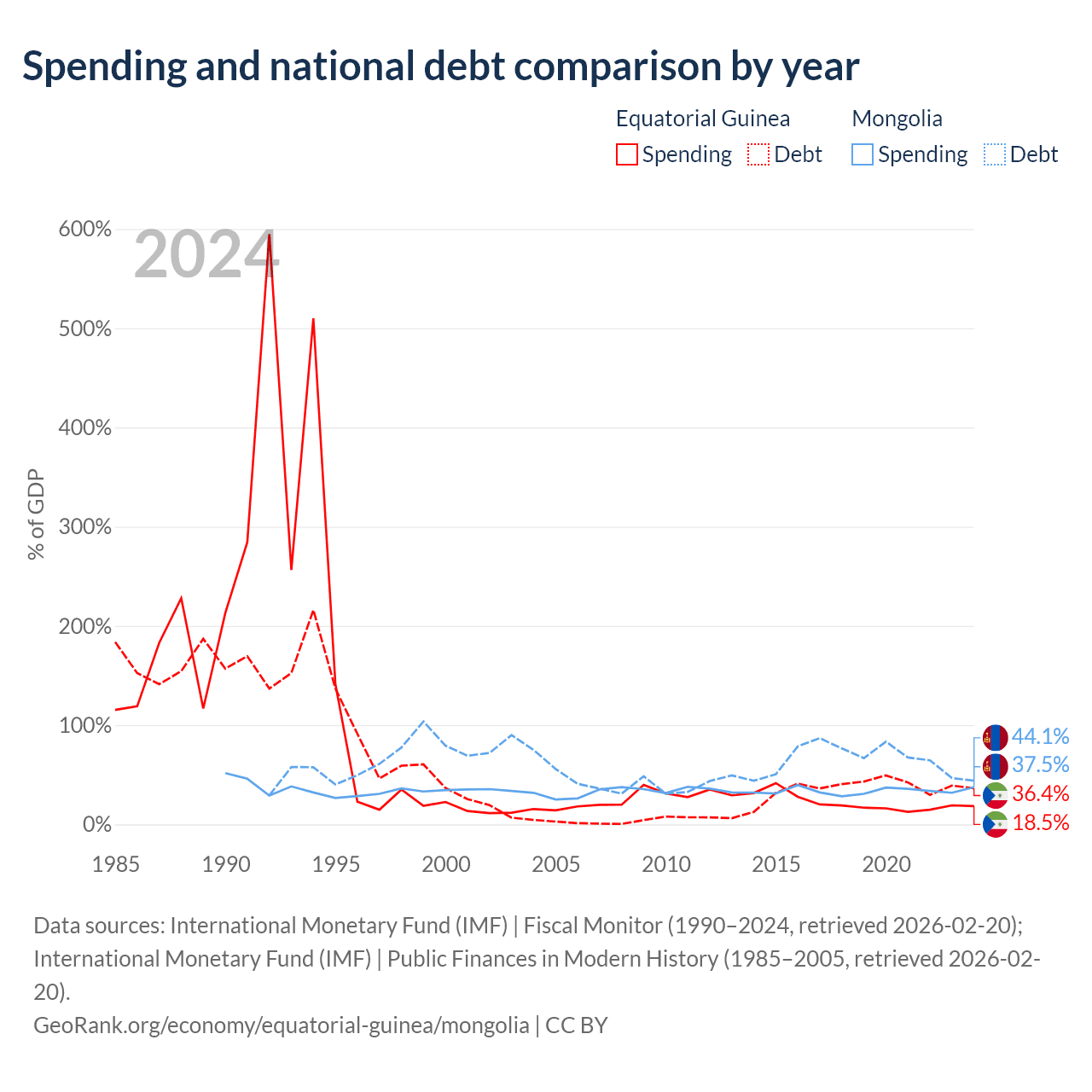 Equatorial Guinea has $4.65B in government debt (36.4% of GDP), compared to $10.5B (44.1% of GDP) in Mongolia.