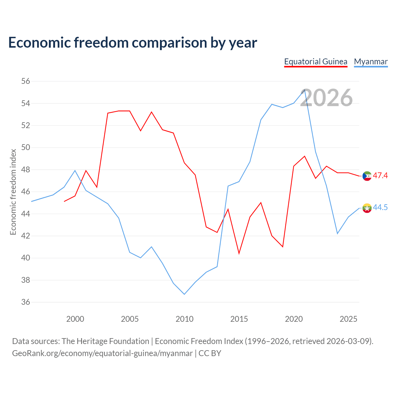 The Economic Freedom Index for Equatorial Guinea is 47.4, ranking 175/197, compared to 44.5 for Myanmar, ranking 180/197. The chart above displays a comparison of annual changes in economic freedom indexes.