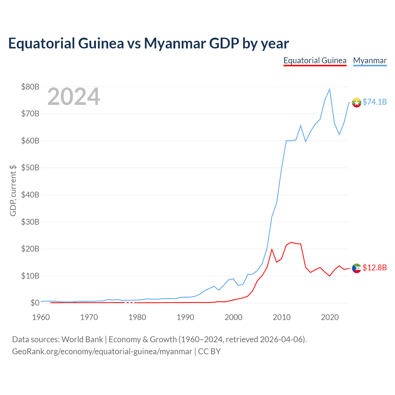 Equatorial Guinea has a GDP of $12.8B compared to $74.1B for Myanmar, ranking 148/197 and 85/197 by economy size, respectively.