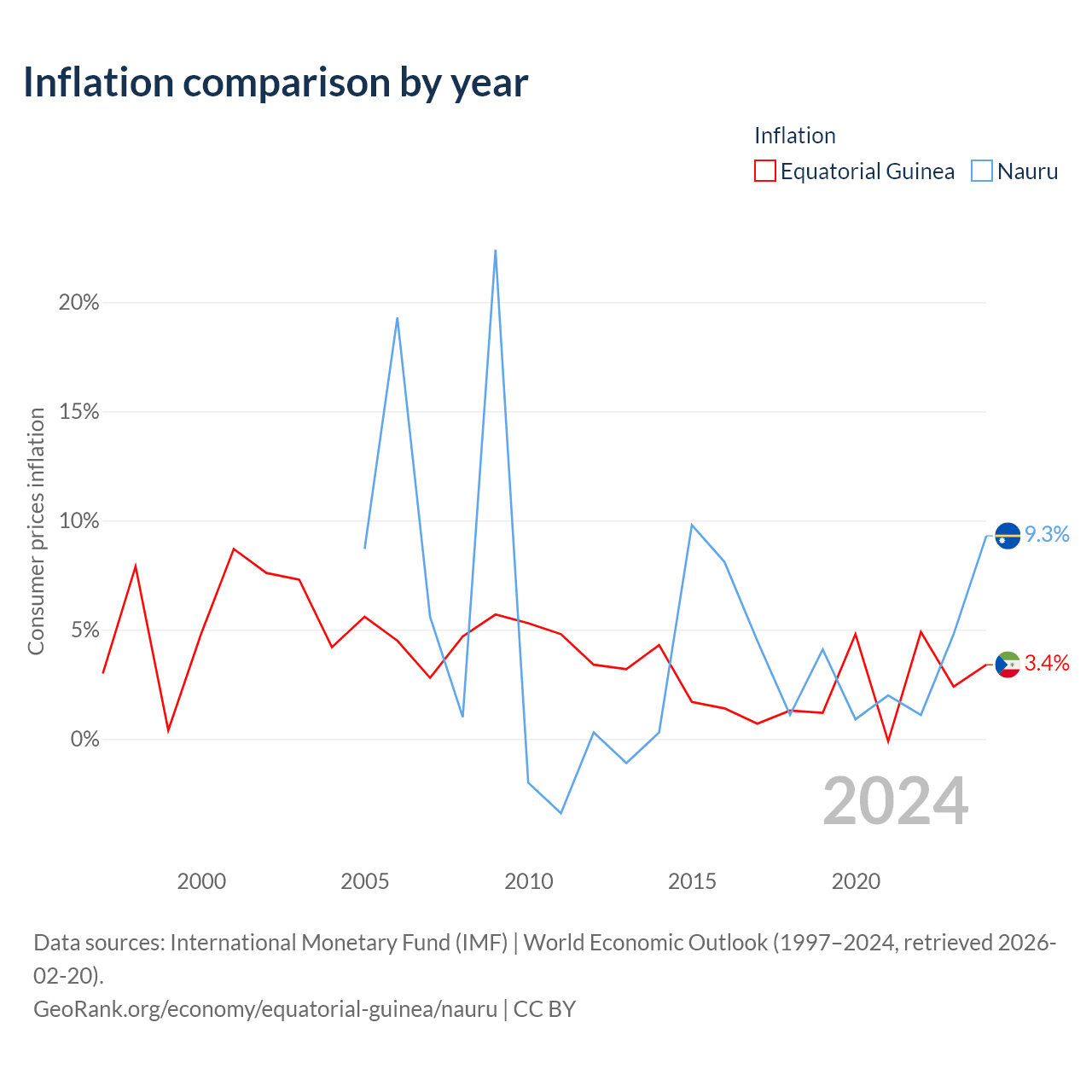 Over the past 20 years, Equatorial Guinea has recorded an average annual inflation rate of 3.3%, compared with 4.84% in Nauru. In 2024, inflation was 3.4% in Equatorial Guinea and 9.3% in Nauru.
