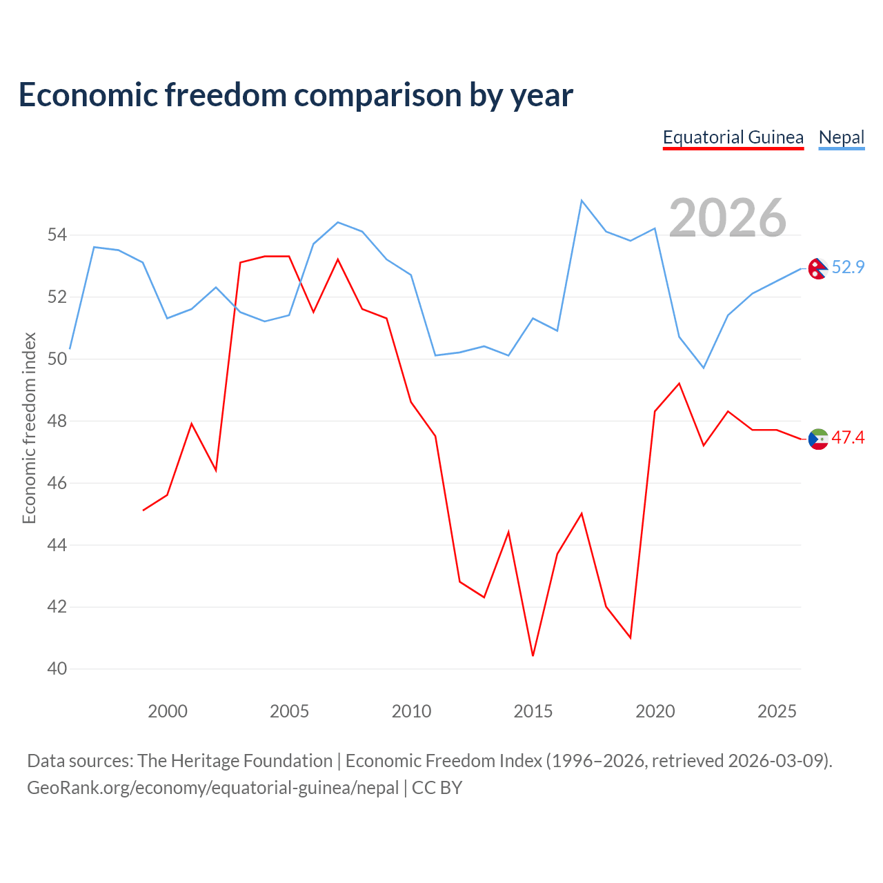 The Economic Freedom Index for Equatorial Guinea is 47.4, ranking 175/197, compared to 52.9 for Nepal, ranking 144/197. The chart above displays a comparison of annual changes in economic freedom indexes.