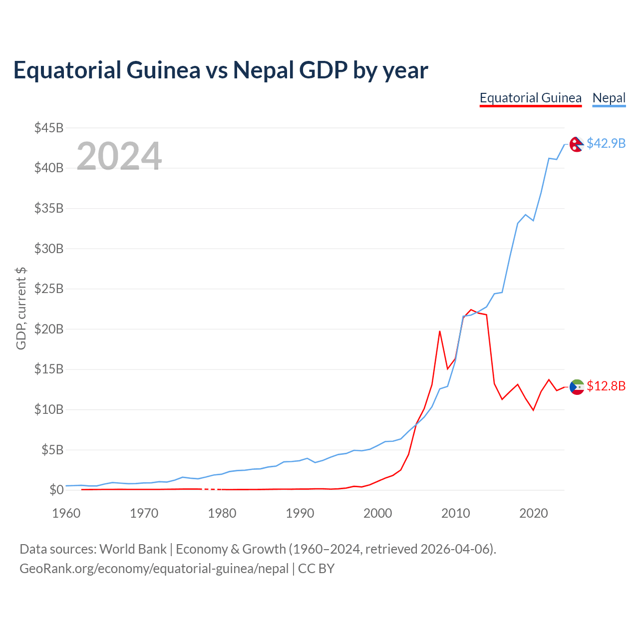 Equatorial Guinea has a GDP of $12.8B compared to $42.9B for Nepal, ranking 148/197 and 101/197 by economy size, respectively.