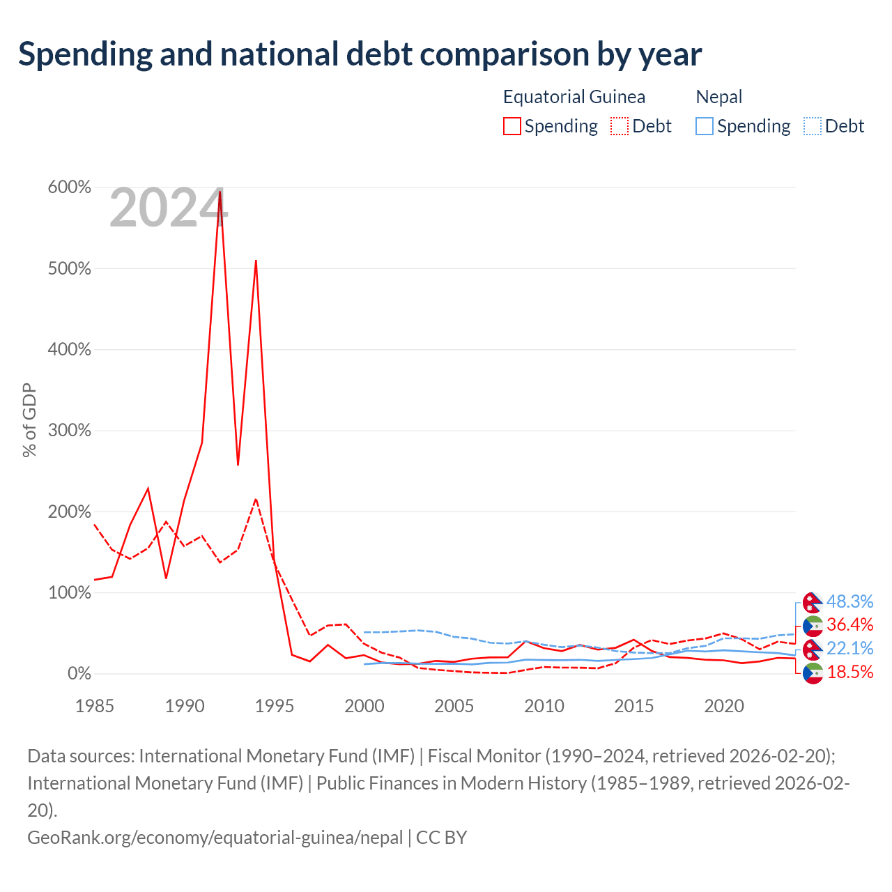 Equatorial Guinea has $4.65B in government debt (36.4% of GDP), compared to $20.7B (48.3% of GDP) in Nepal.