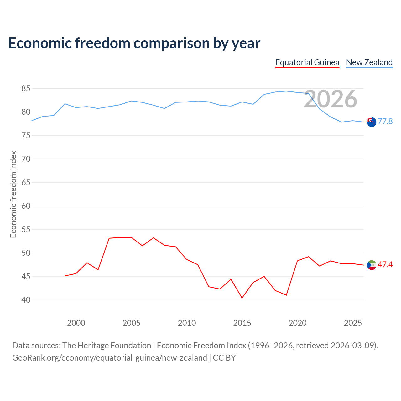 The Economic Freedom Index for Equatorial Guinea is 47.4, ranking 175/197, compared to 77.8 for New Zealand, ranking 13/197. The chart above displays a comparison of annual changes in economic freedom indexes.