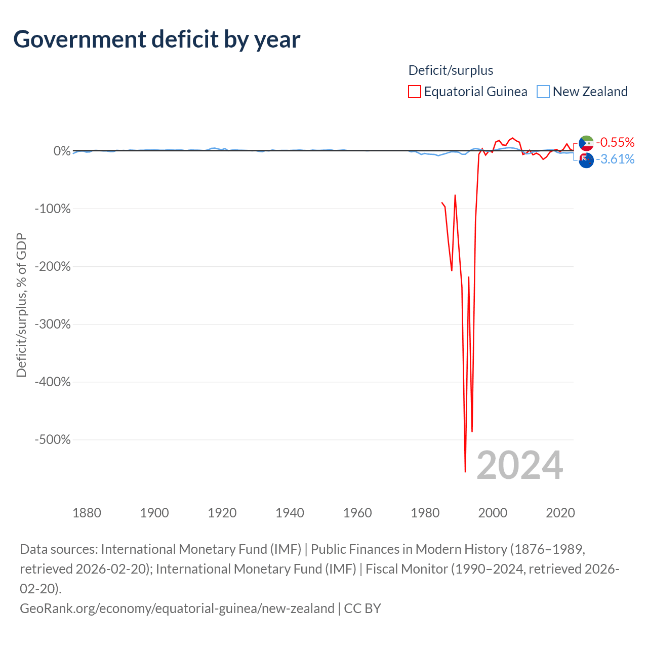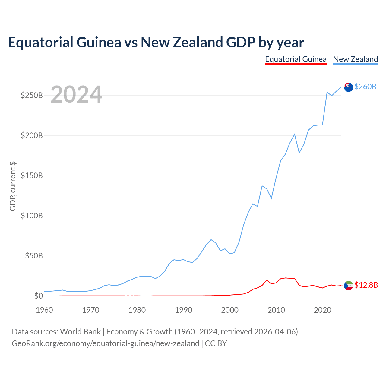 Equatorial Guinea has a GDP of $12.8B compared to $260B for New Zealand, ranking 148/197 and 52/197 by economy size, respectively.