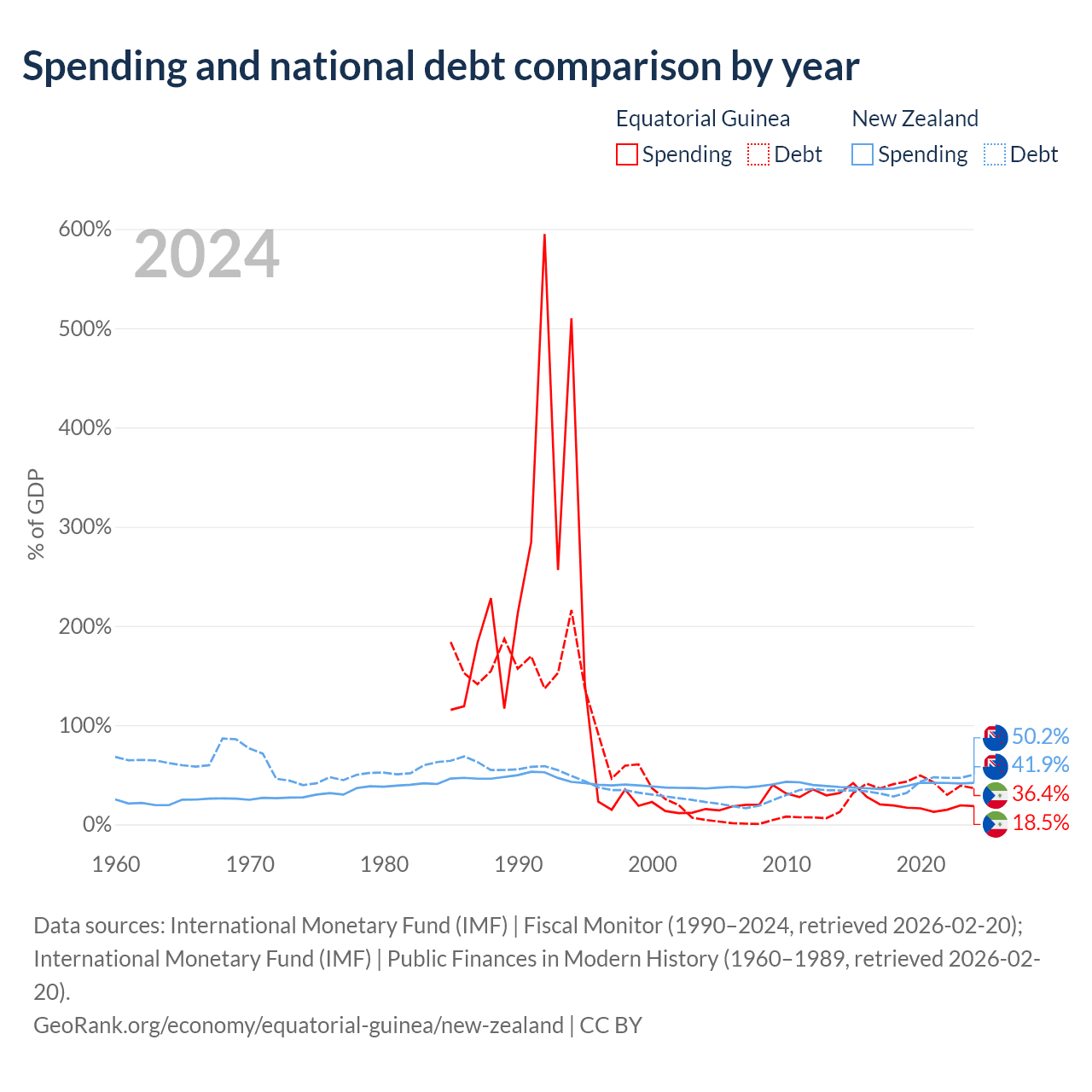 Equatorial Guinea has $4.65B in government debt (36.4% of GDP), compared to $131B (50.2% of GDP) in New Zealand.