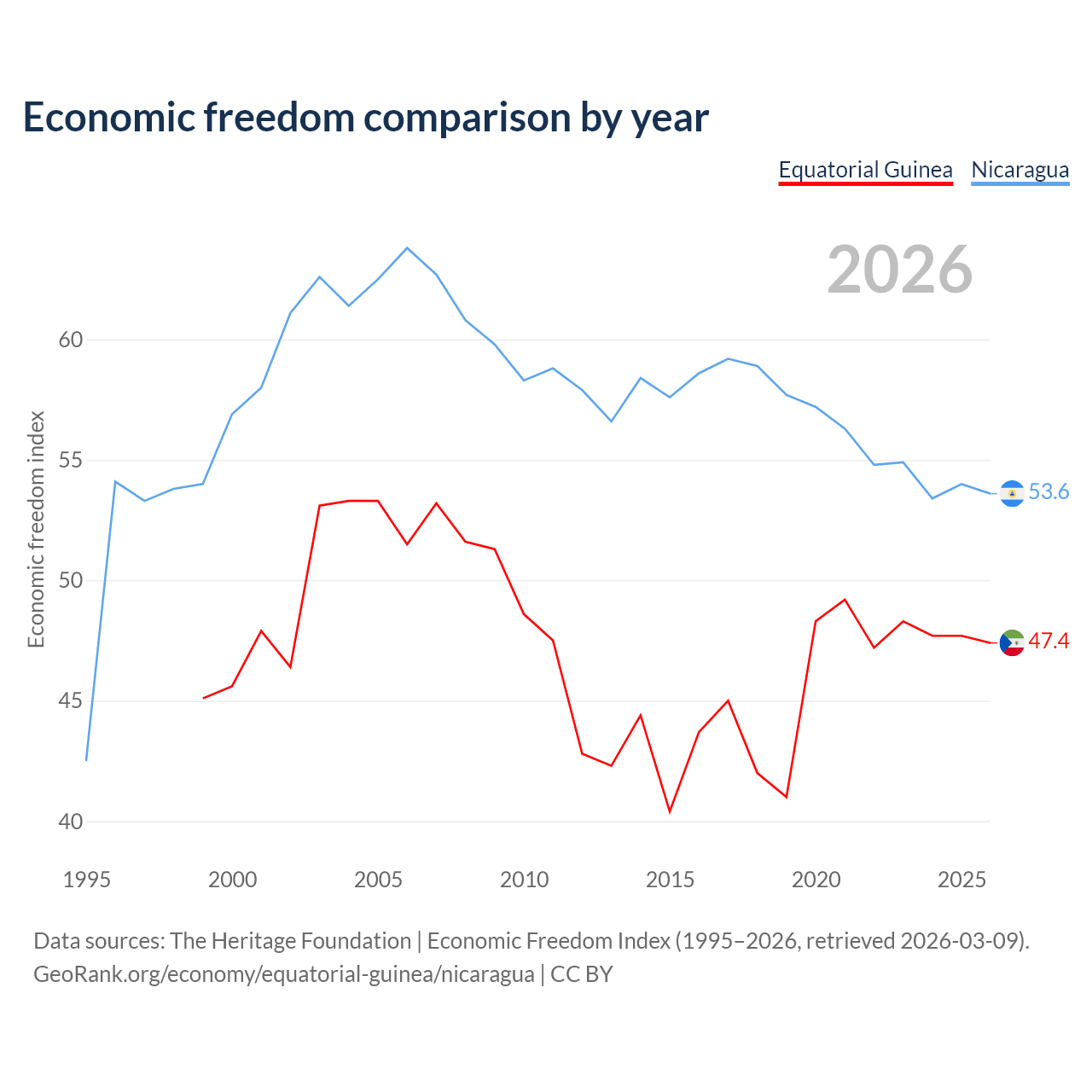 The Economic Freedom Index for Equatorial Guinea is 47.4, ranking 175/197, compared to 53.6 for Nicaragua, ranking 139/197. The chart above displays a comparison of annual changes in economic freedom indexes.