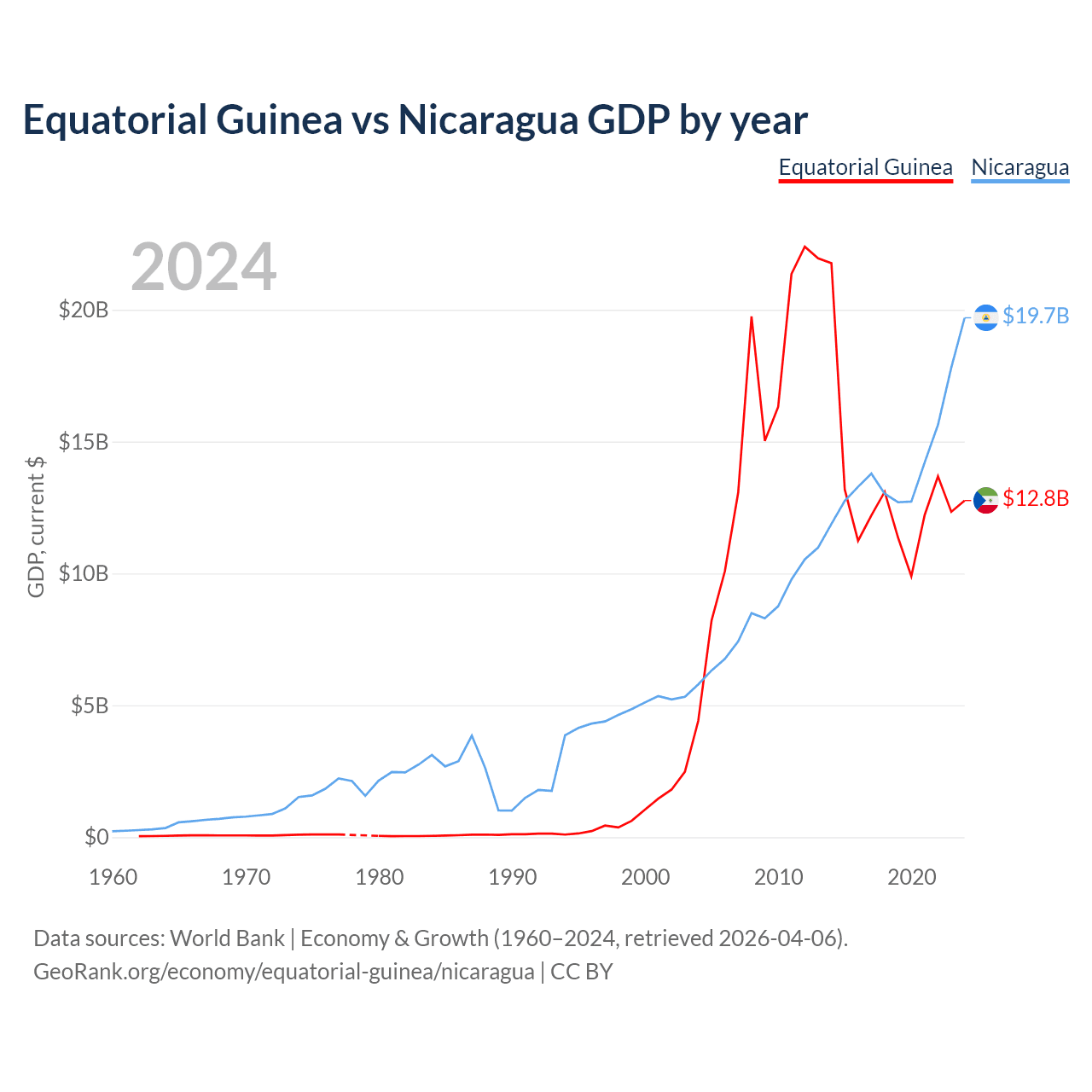 Equatorial Guinea has a GDP of $12.8B compared to $19.7B for Nicaragua, ranking 148/197 and 131/197 by economy size, respectively.