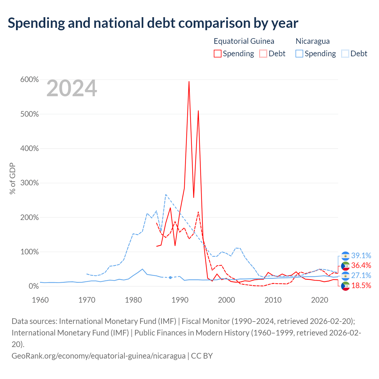 Equatorial Guinea has $4.65B in government debt (36.4% of GDP), compared to $7.71B (39.1% of GDP) in Nicaragua.