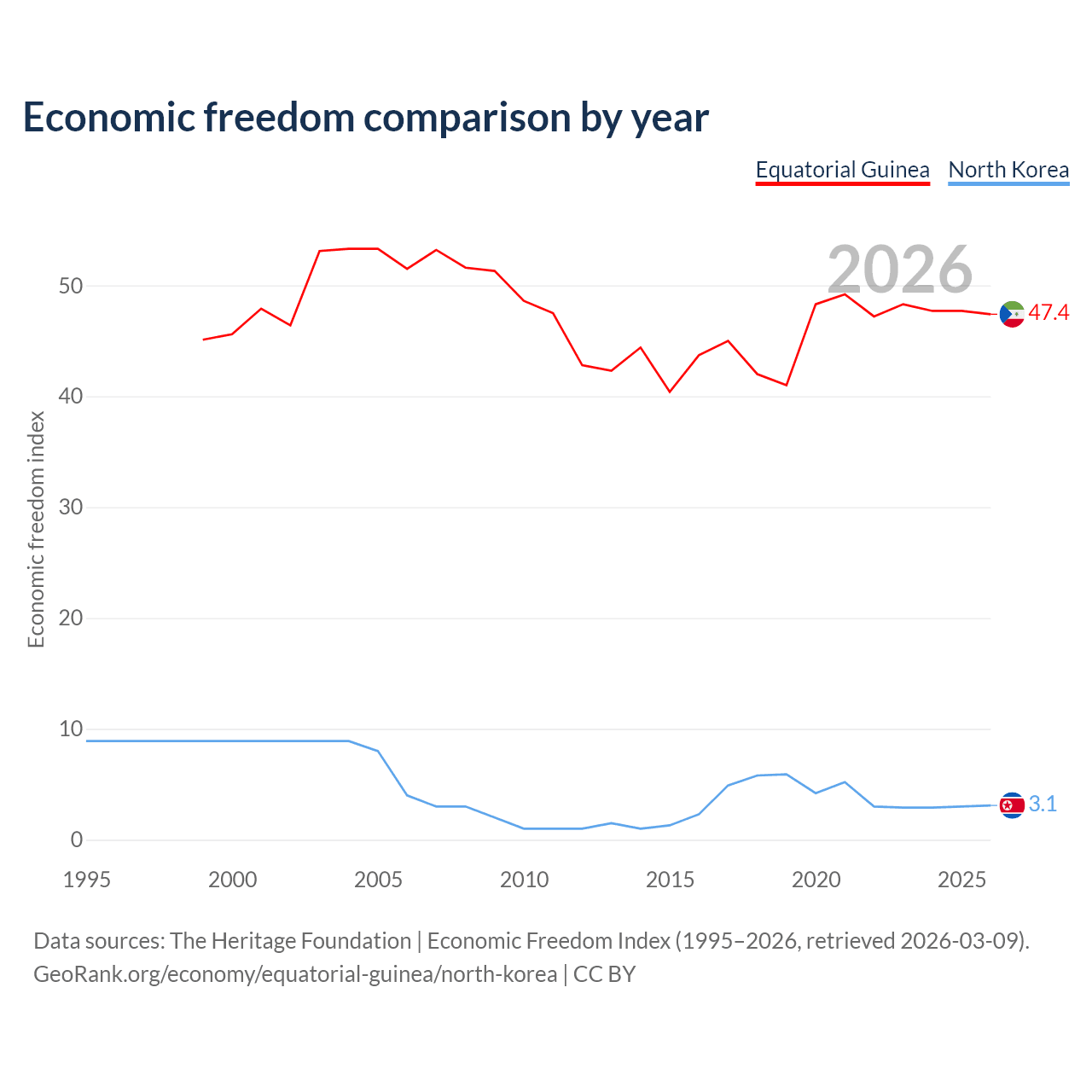 The Economic Freedom Index for Equatorial Guinea is 47.4, ranking 175/197, compared to 3.1 for North Korea, ranking 197/197. The chart above displays a comparison of annual changes in economic freedom indexes.