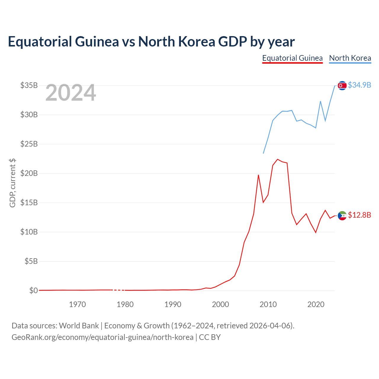 Equatorial Guinea has a GDP of $12.8B compared to $34.9B for North Korea, ranking 148/197 and 106/197 by economy size, respectively.