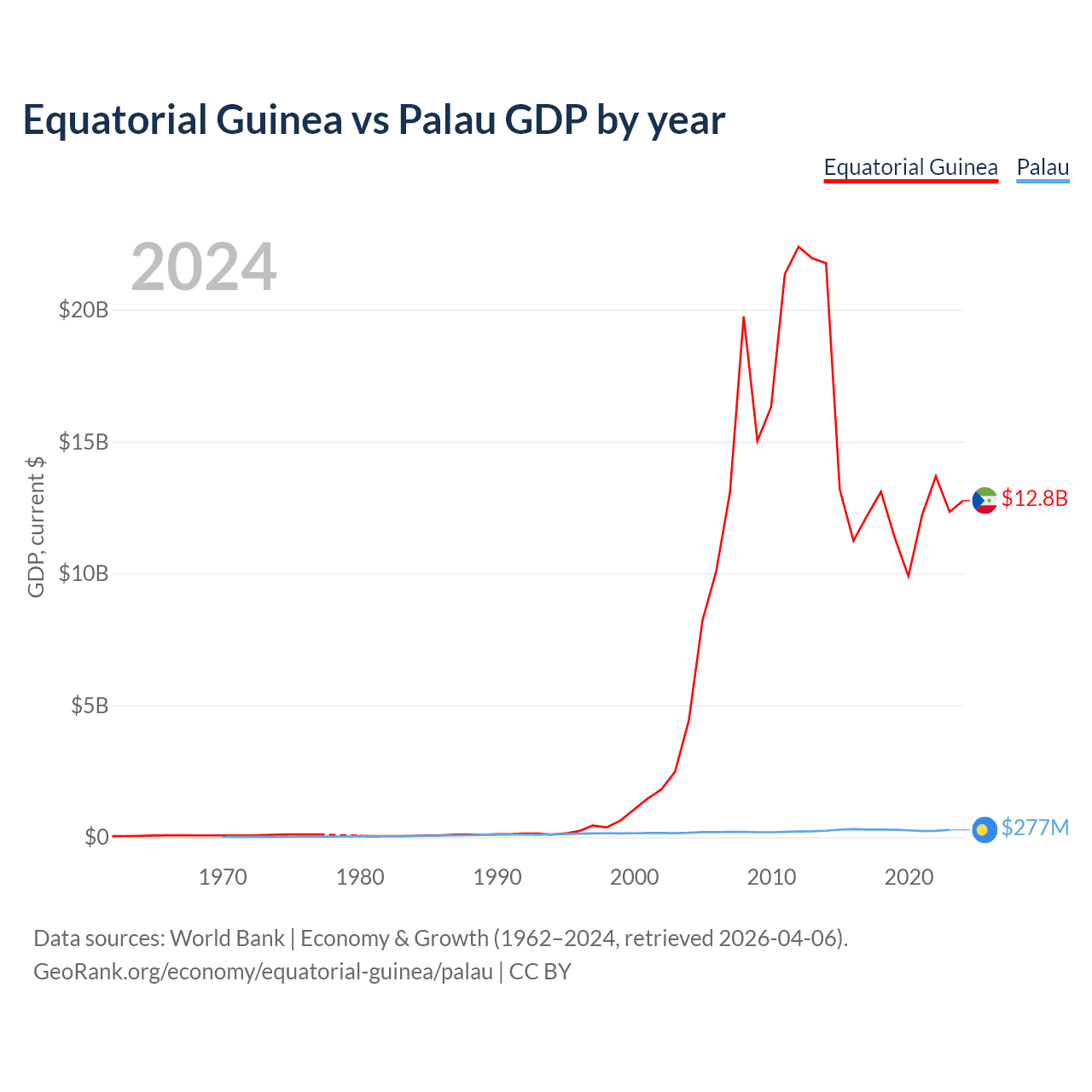 Equatorial Guinea has a GDP of $12.8B compared to $277M for Palau, ranking 148/197 and 194/197 by economy size, respectively.